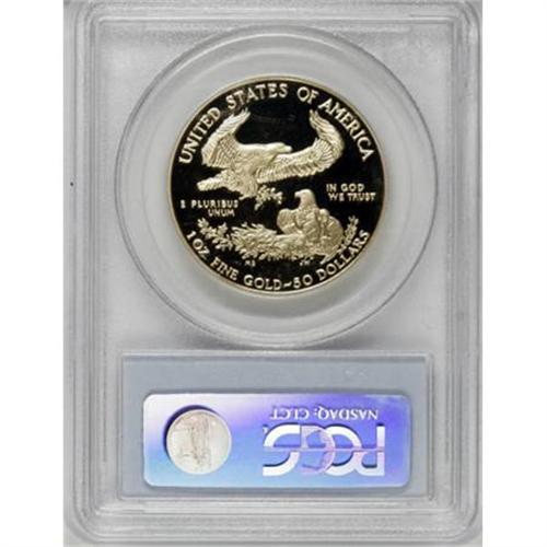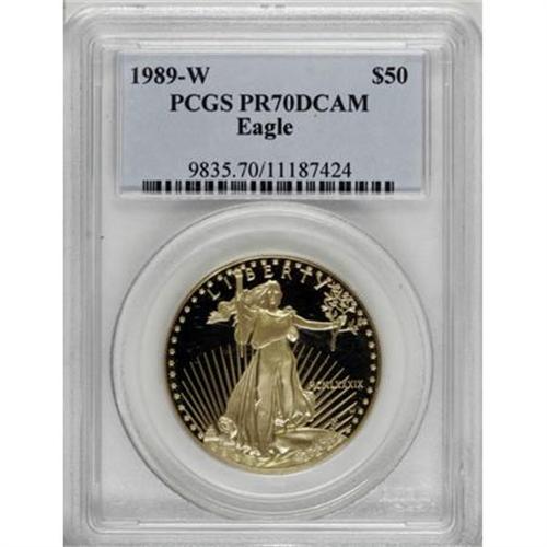 <B>1989-W G$50 One-Ounce Gold Eagle PR70 Deep Cameo PCGS.</B></I> A technically perfect one-ounce American Eagle exemplar, boldly impressed with absolute black-and-gold contrast. This proof issue has a mintage of just 54,570 pieces.<BR><BR><b>Shipping:</b> Coins & Currency (<a target="_blank" href="http://www.heritageauctions.com/common/shipping.php">view shipping information</a>)