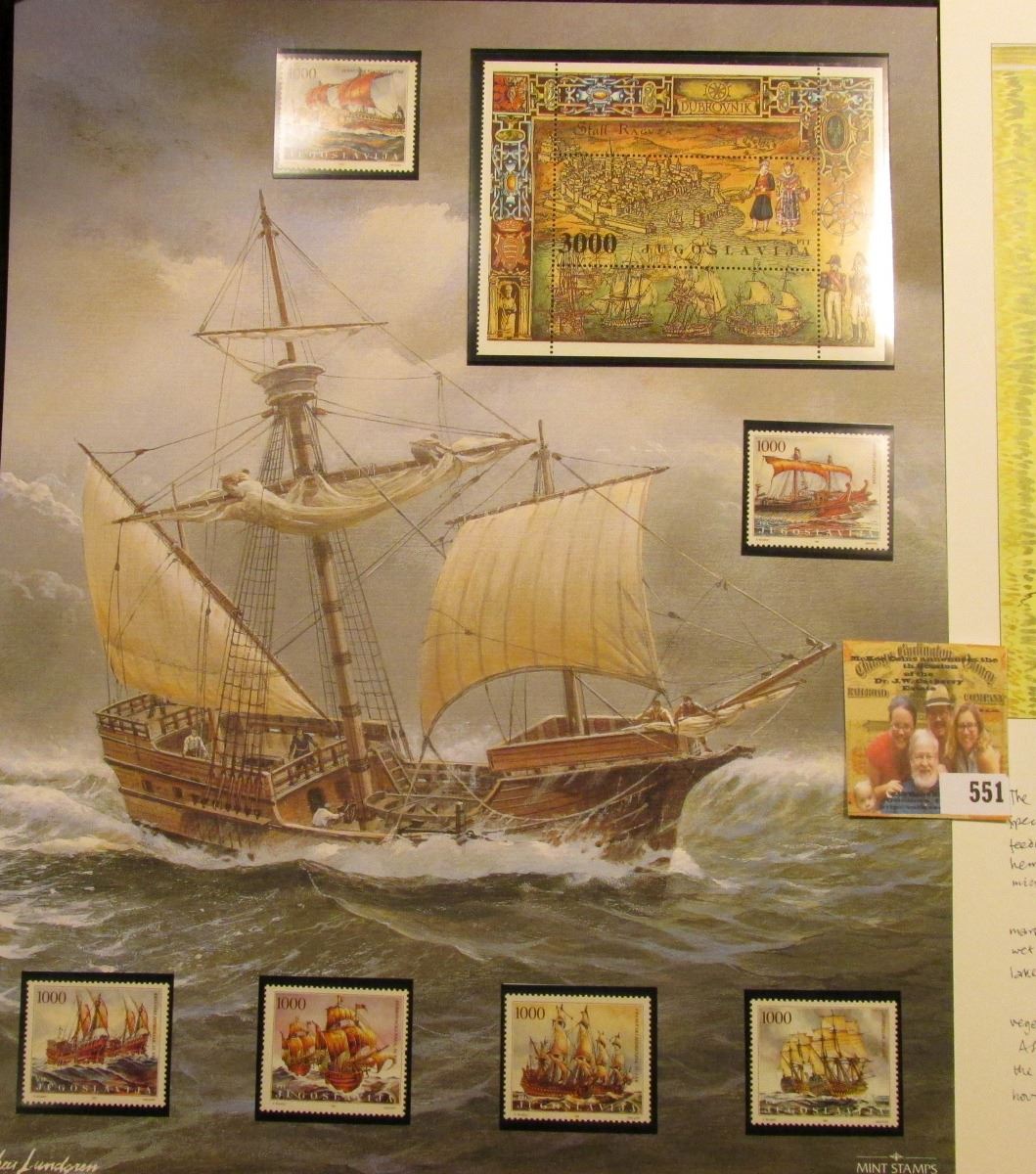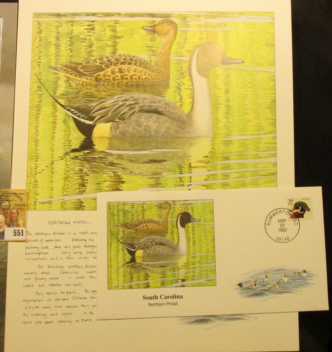 1989 Yugoslavia Sailing Ships Stamps; South Carolina Northern Pintail Stamped Cover; & a Ducks Unlimited Print of Northern Pintail with description.