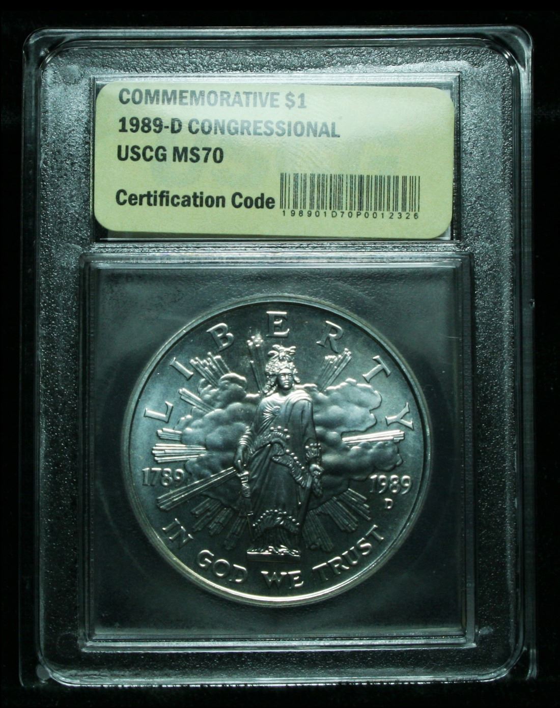 1989-d Congress . . Modern Commem Dollar $1 Graded ms70, Perfection By USCG. Issued to celebrate the Golden Anniversary of The completion of Mount Rushmore. PCGS lists an ms70 at $525. This coin is Graded perfect ms70 by USCG. Estimated Value $300.