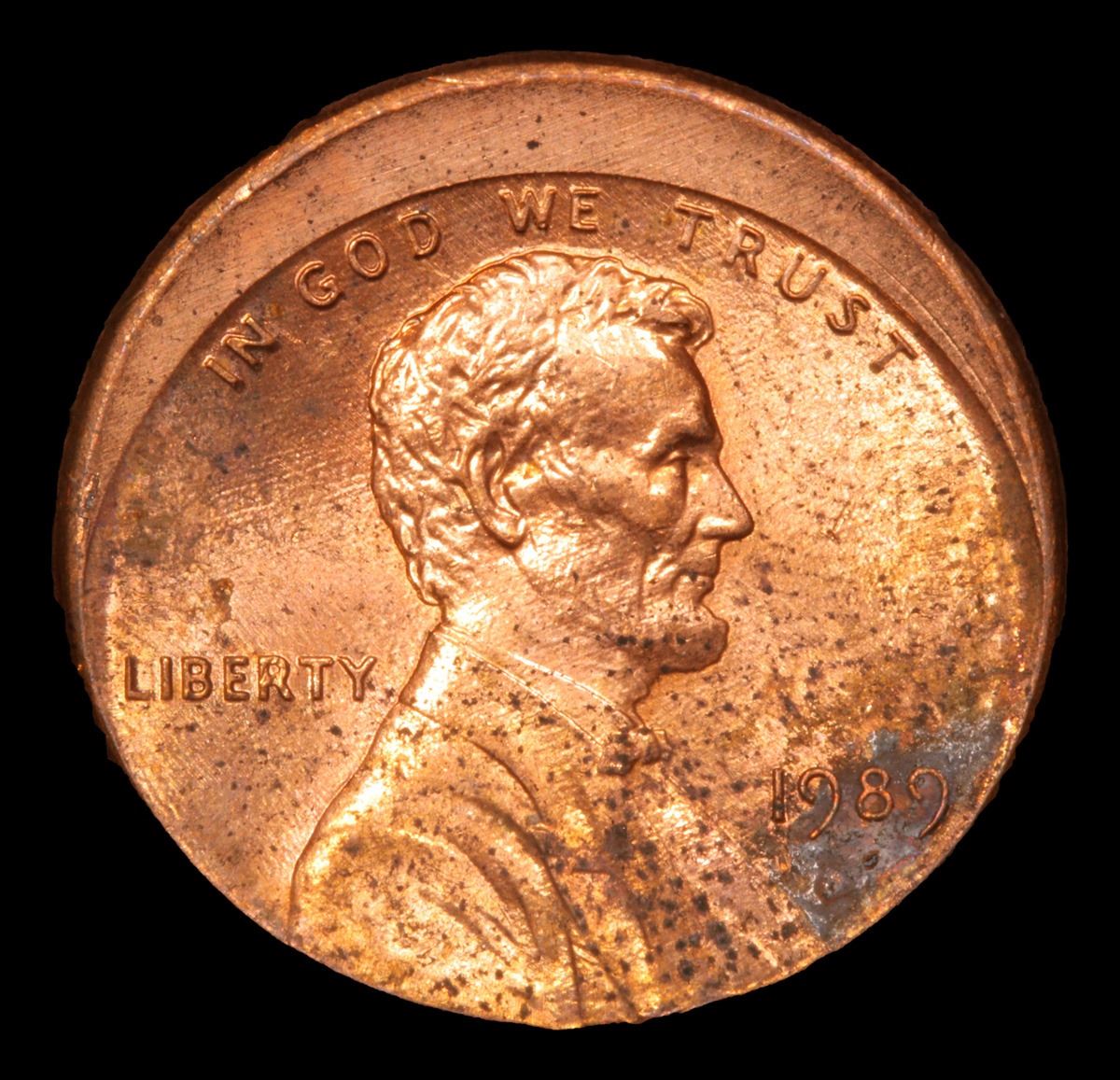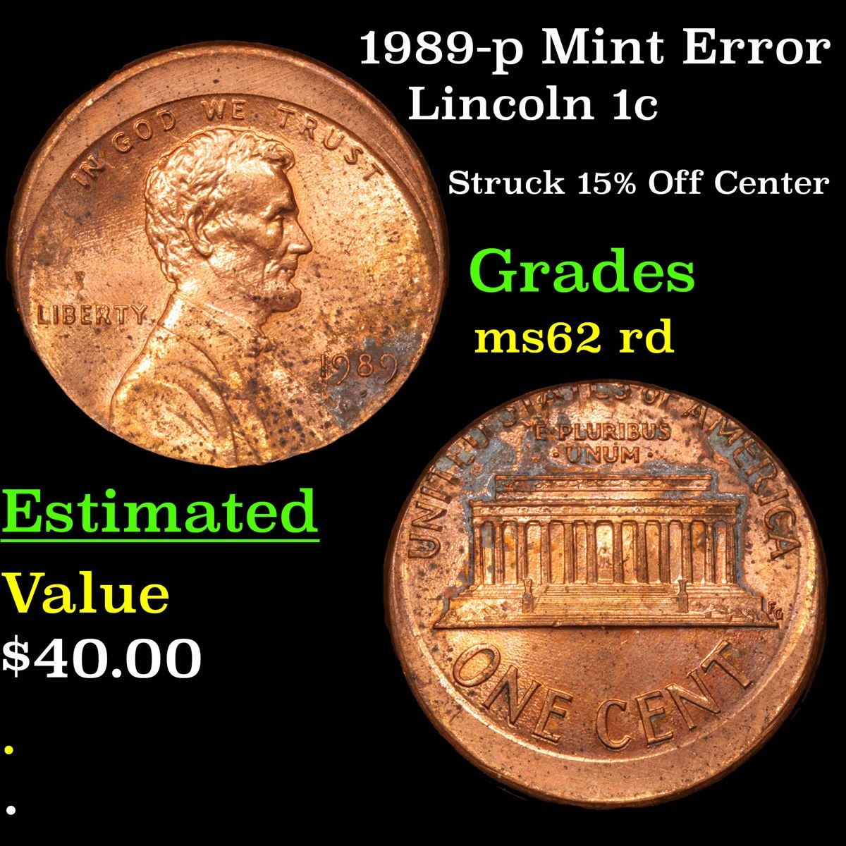 1989-p Mint Error Struck 15% Off Center . Lincoln Cent 1c Grades Select Unc RD.