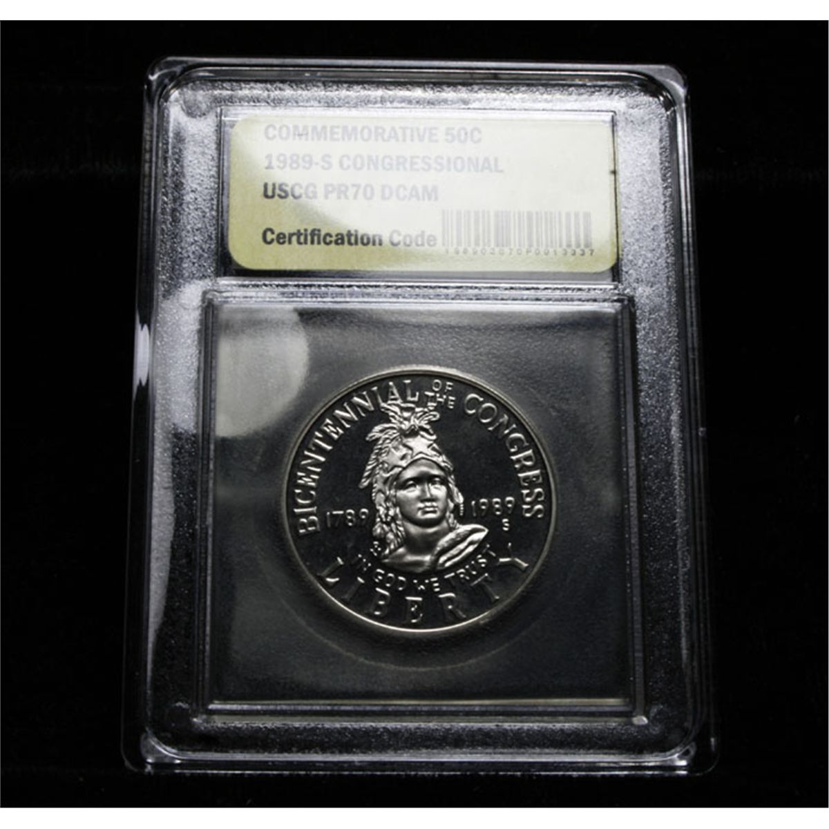 The 1989 Congress Bicentennial Commemorative Half Dollar was one of three coins released to celebrate the 200th anniversary of Congress. The legislative body had first convened under the US Constitution in 1789 in Philadelphia. Certified and Graded PR70 Deep Cameo by USCG PCGS lists PR70 at $1800. Estimated Value $350