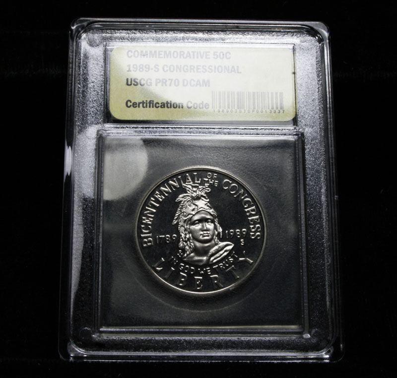 The 1989 Congress Bicentennial Commemorative Half Dollar was one of three coins released to celebrate the 200th anniversary of Congress. The legislative body had first convened under the US Constitution in 1789 in Philadelphia. Certified and Graded PR70 Deep Cameo by USCG PCGS lists PR70 at $1800. Estimated Value $350