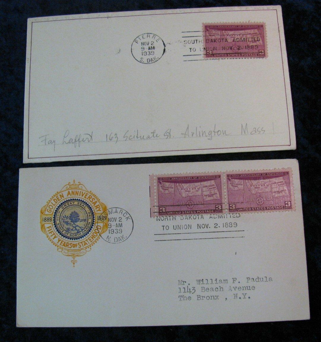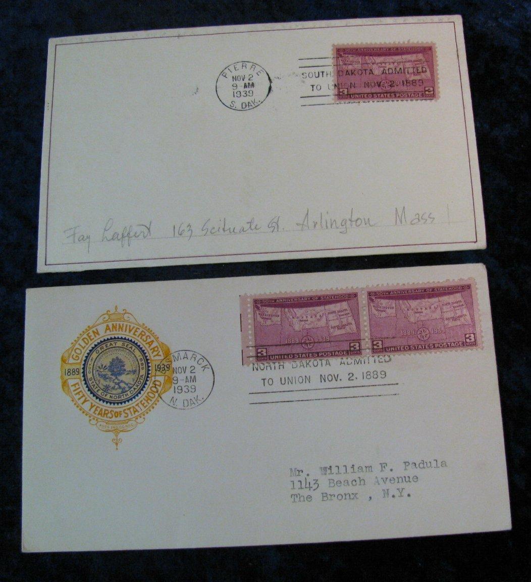 199. (2) 1939 "50th Anniversary of Statehood" Stamped Covers with postmarks "North Dakota Admitted to Union Nov. 2, 1889" and "South Dakota Admitted to Union Nov. 2, 1889".