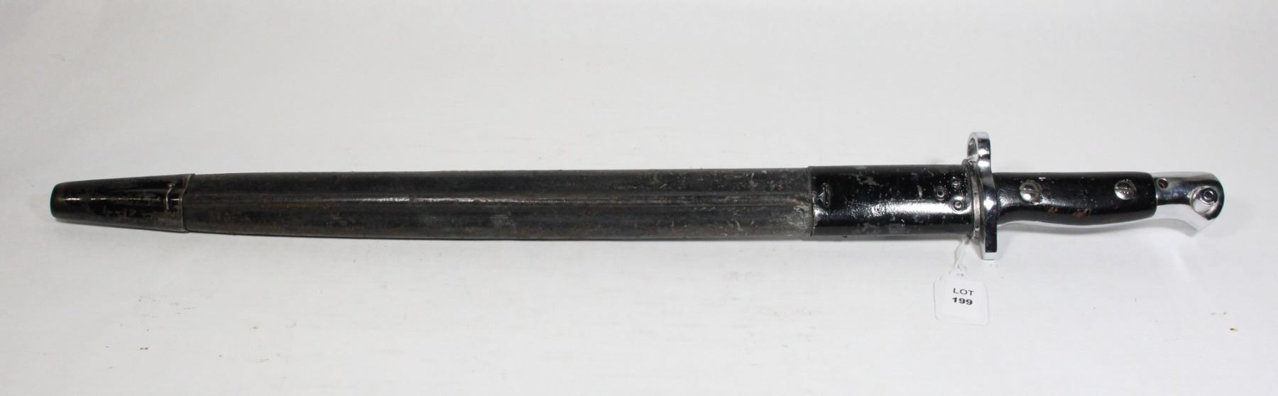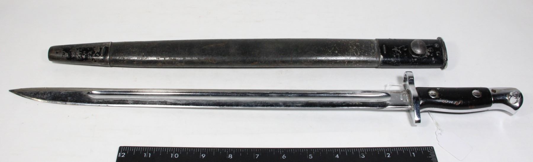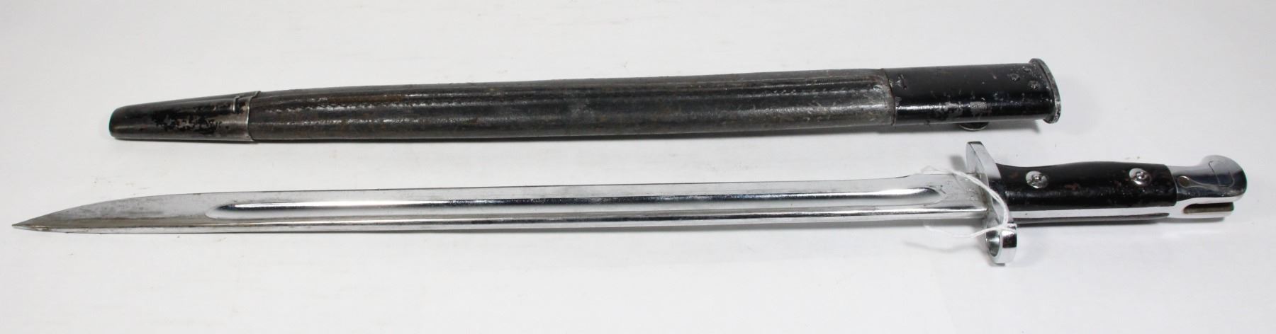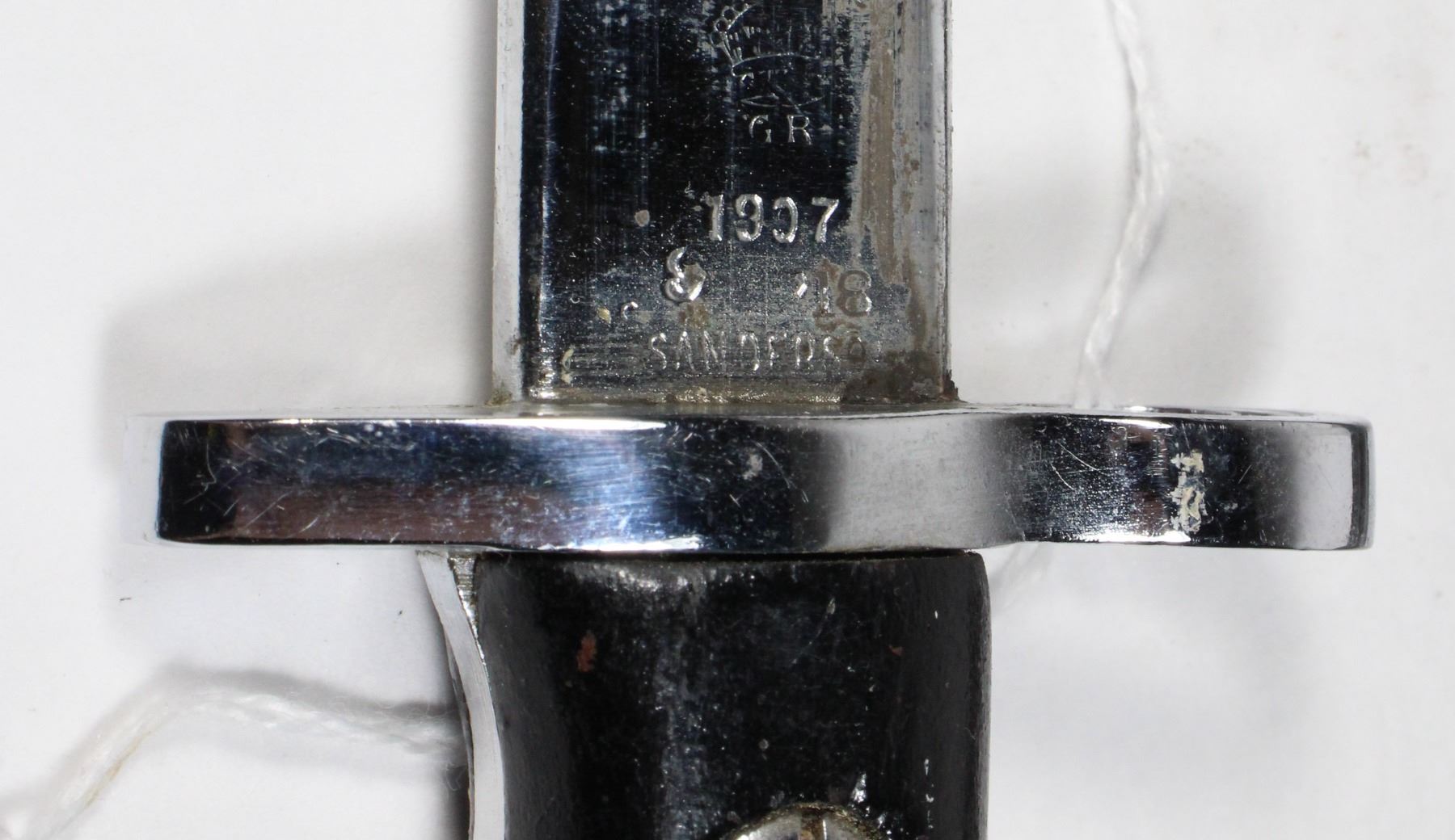 CHROMED BLADE FOR PARADE, SANDERSON AND BROAD ARROW MARKED WITH SCABBARD REISSUED DURING WORLD WAR TWO FOR HOME FRONT. WORLD WAR ONE BRITISH BAYONET BLADE ALLIED FORCES UNITED KINGDOM BRITISH EMPIRE. MEASURES 23 INCHES IN SCABBARD, WITH 17 INCH BLADE.