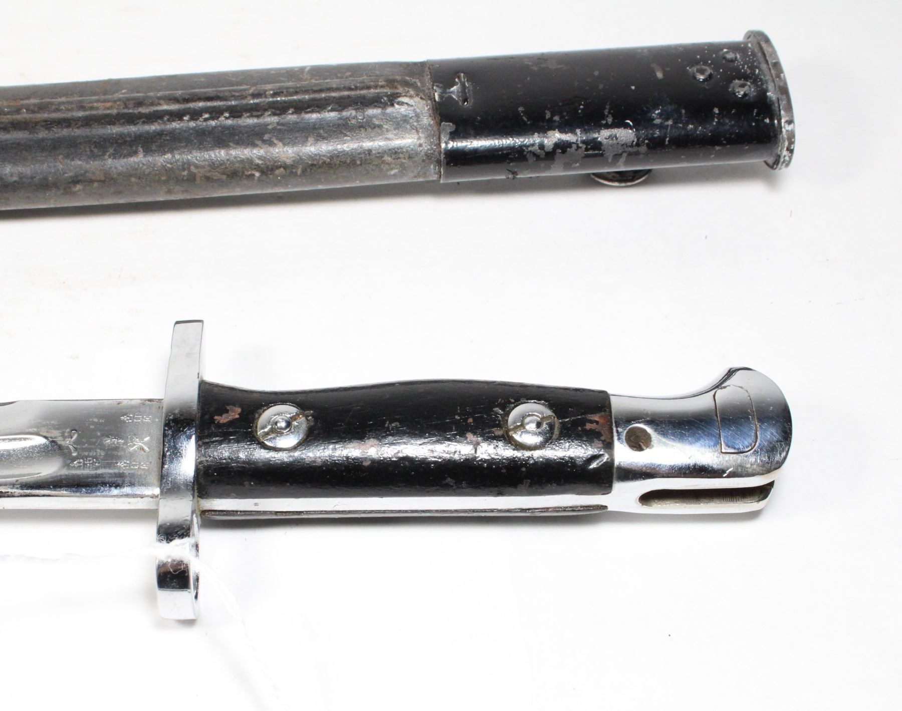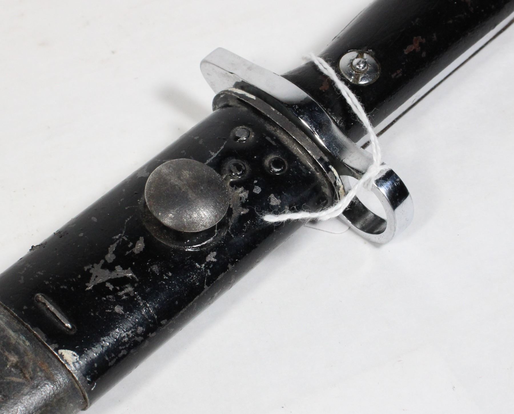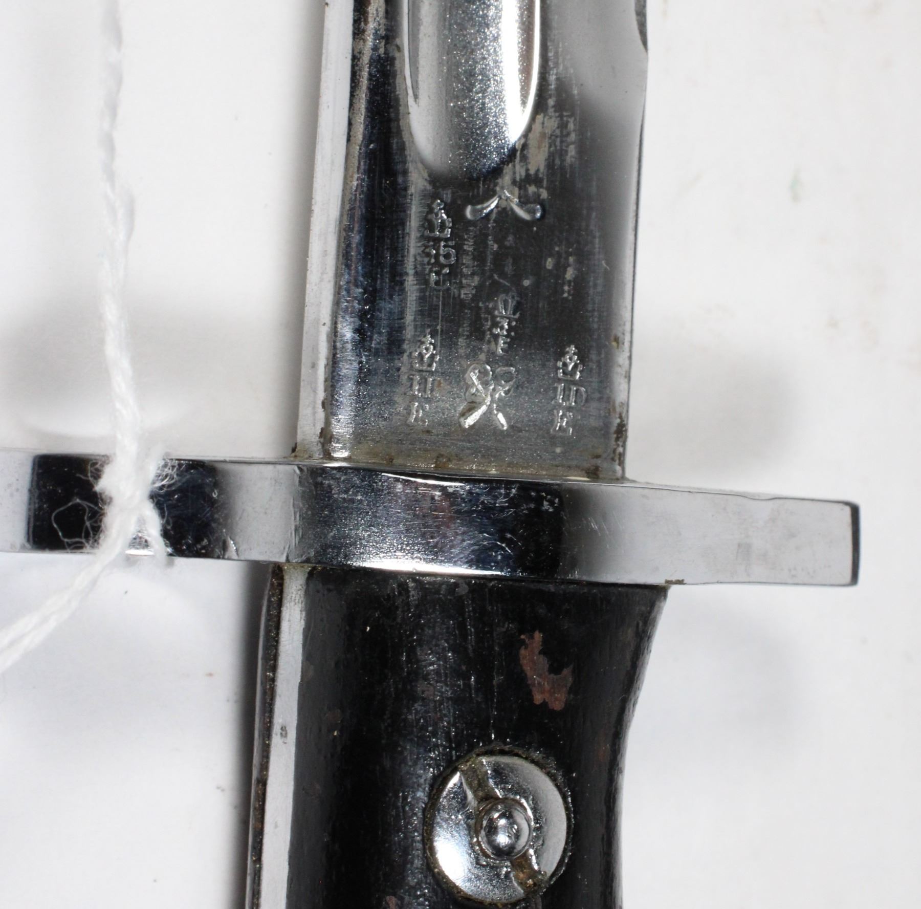 CHROMED BLADE FOR PARADE, SANDERSON AND BROAD ARROW MARKED WITH SCABBARD REISSUED DURING WORLD WAR TWO FOR HOME FRONT. WORLD WAR ONE BRITISH BAYONET BLADE ALLIED FORCES UNITED KINGDOM BRITISH EMPIRE. MEASURES 23 INCHES IN SCABBARD, WITH 17 INCH BLADE.