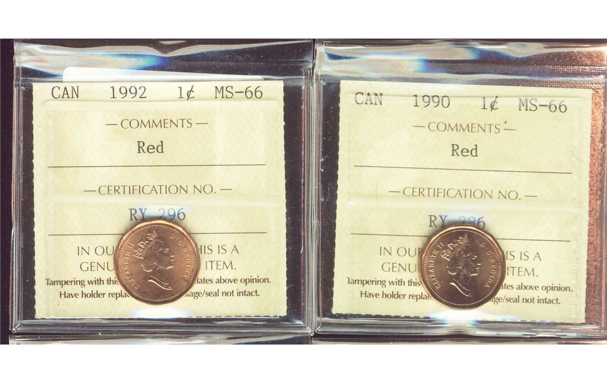 1990 1¢ & 1992 ICCS MS66RD. Lot of 2 coins.
