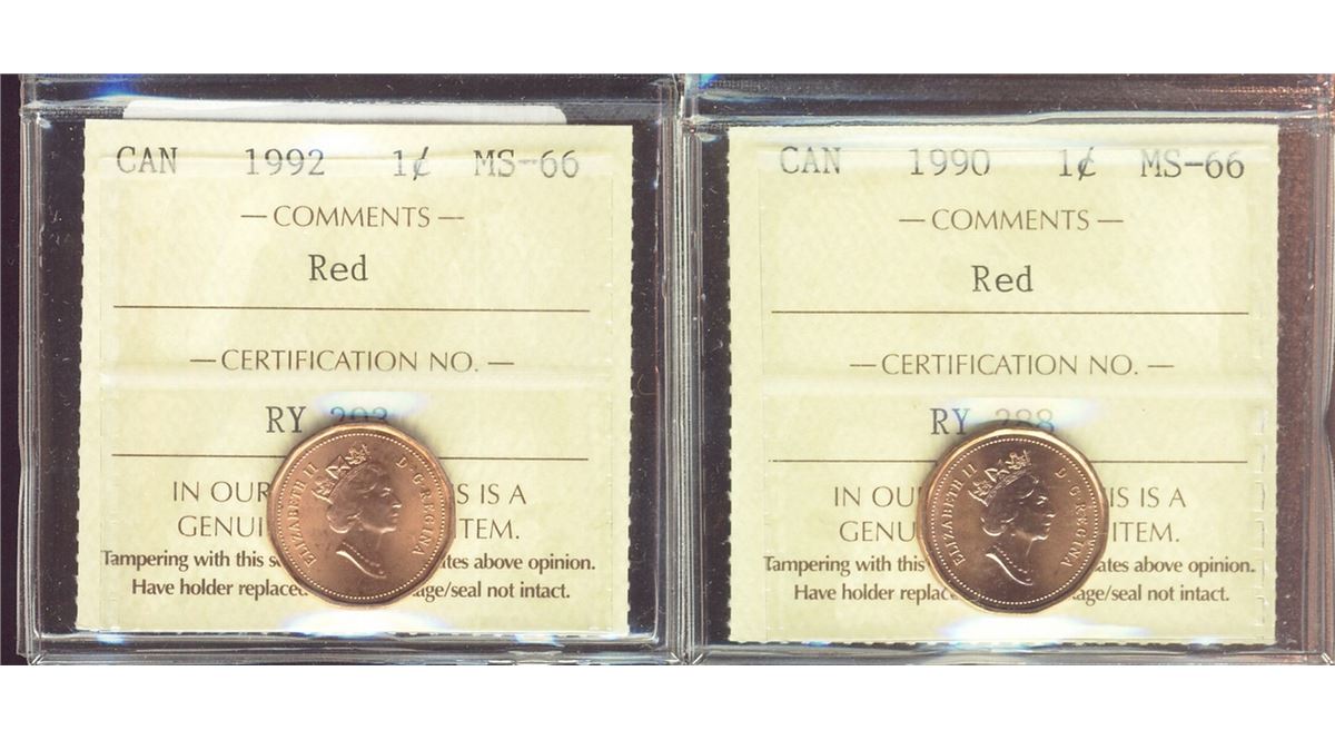 1990 1¢ & 1992 ICCS MS66RD. Lot of 2 coins.