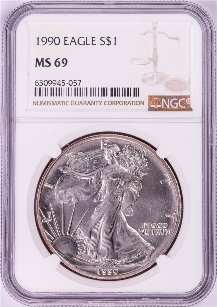 One 1990 $1 American Silver Eagle Coin NGC MS69. NGC Certified.