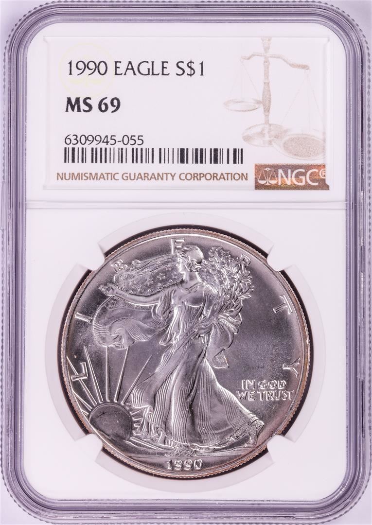 One 1990 $1 American Silver Eagle Coin NGC MS69. NGC Certified.