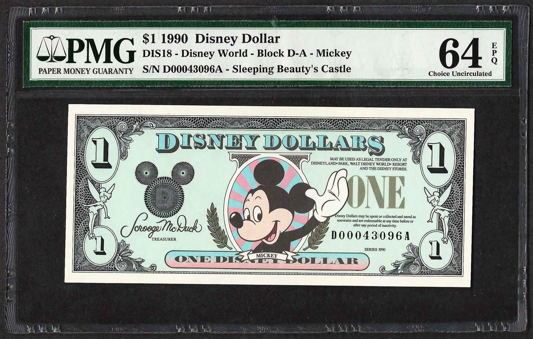 One 1990 $1 Disney Dollars Note PMG Choice Uncirculated 64EPQ. PMG Certified.