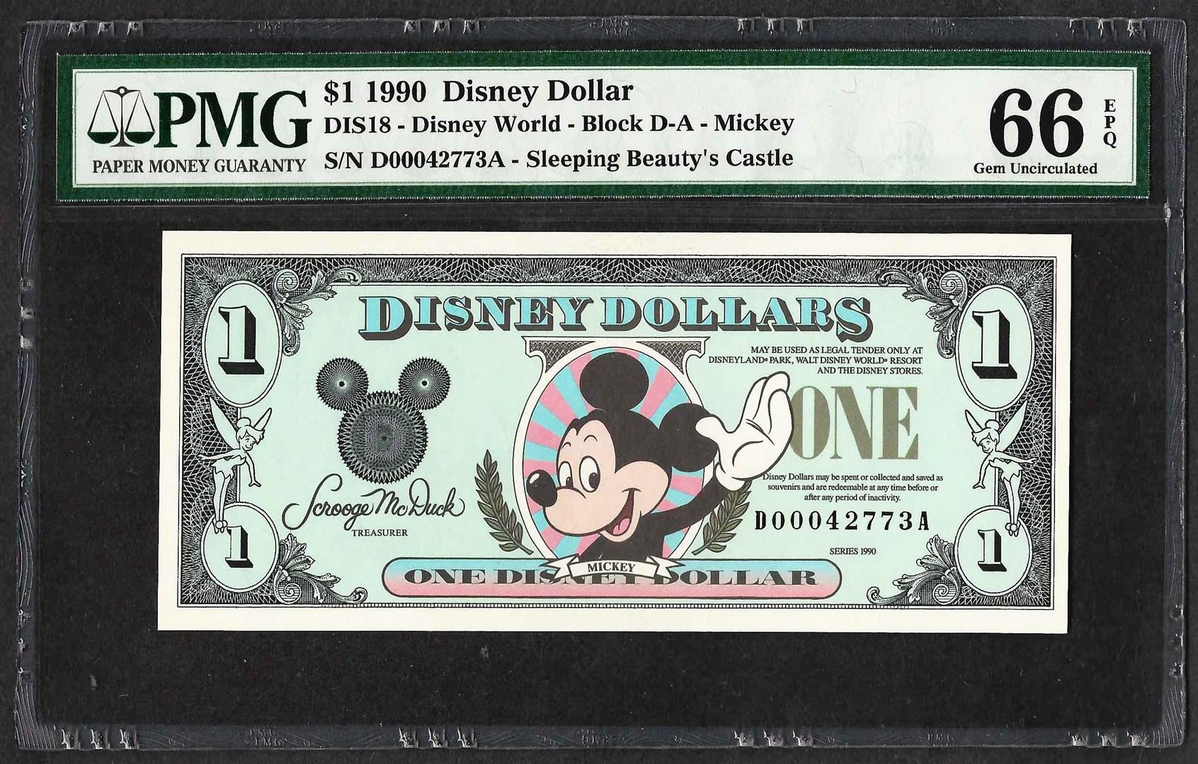 One 1990 $1 Disney Dollars Note PMG Gem Uncirculated 66EPQ.