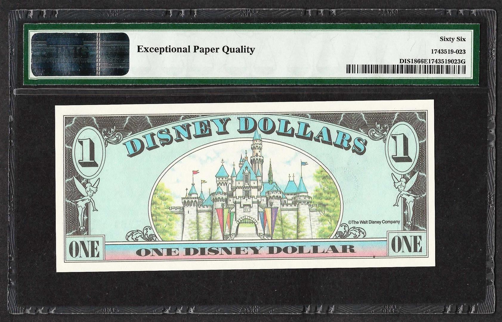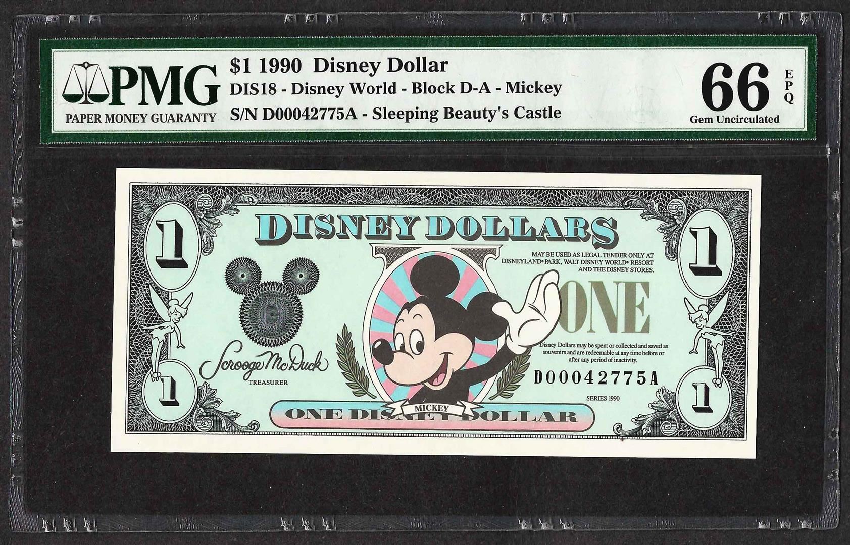 One 1990 $1 Disney Dollars Note PMG Gem Uncirculated 66EPQ.