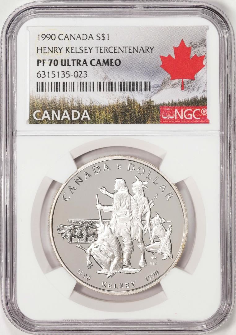 One 1990 $1 Proof Canada Henry Kelsey Tercentenary Silver Dollar Coin NGC PF70 Ultra Cameo. NGC Certified.