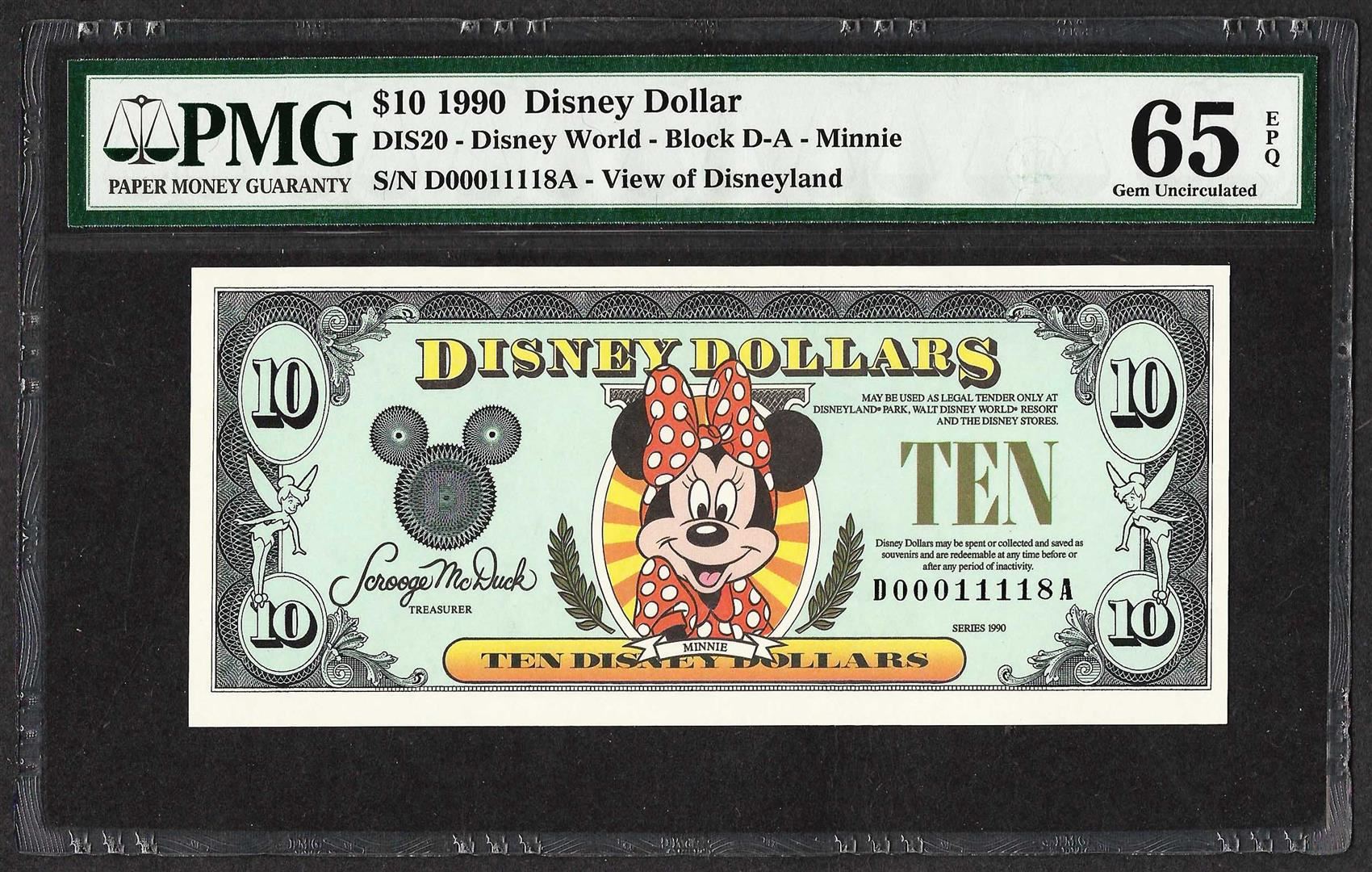 One 1990 $10 Disney Dollars Note PMG Gem Uncirculated 65EPQ. PMG Certified.