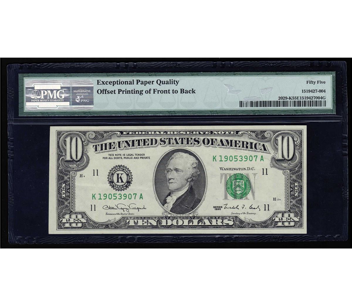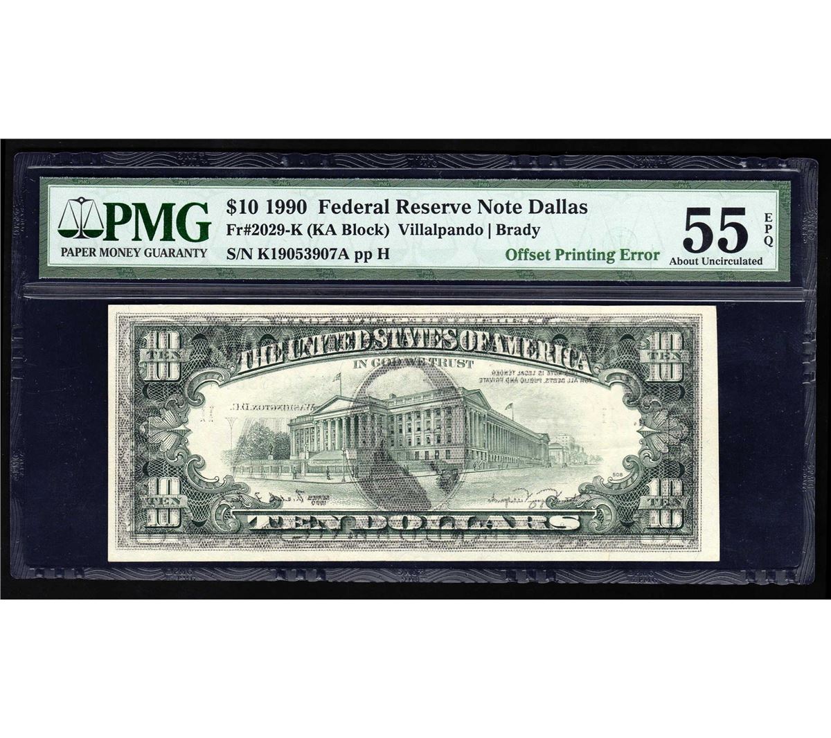 One 1990 $10 Federal Reserve Note Dallas ERROR Offset Printing PMG AU 55EPQ. PMG Certified.