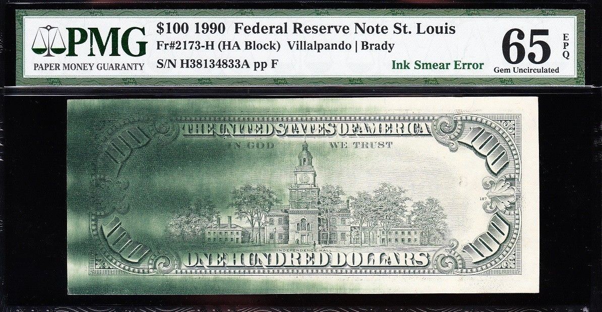 One 1990 $100 St. Louis Federal Reserve Error Note PMG 65EPQ.