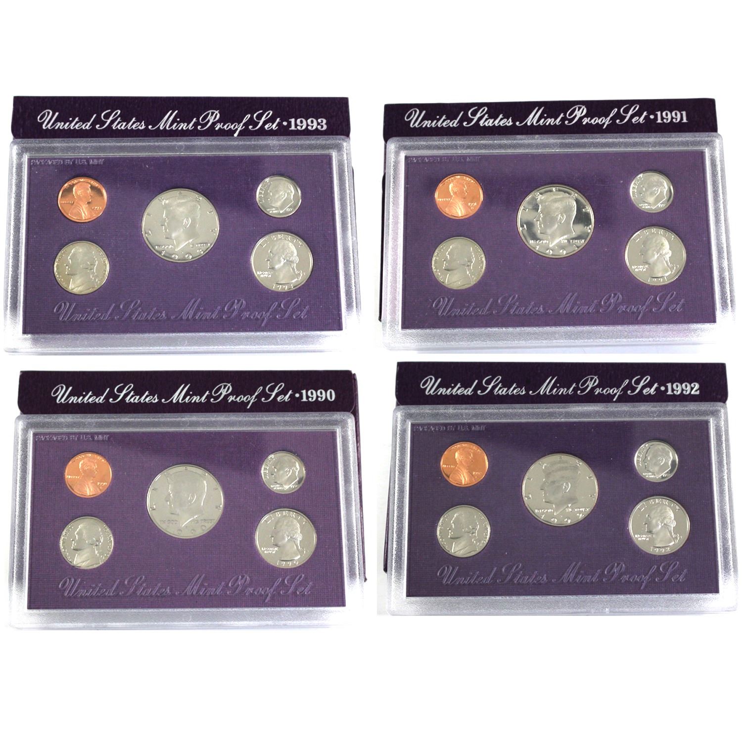 1990,1991,1992 & 1993 United states Proof set with original box and COA. Some coins may have natural toning or tarnish. Outer packaging is worn.