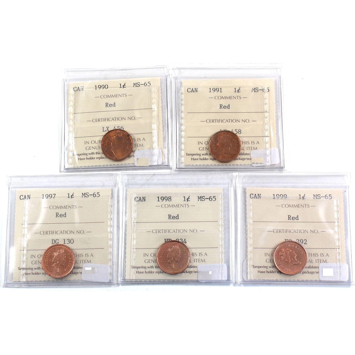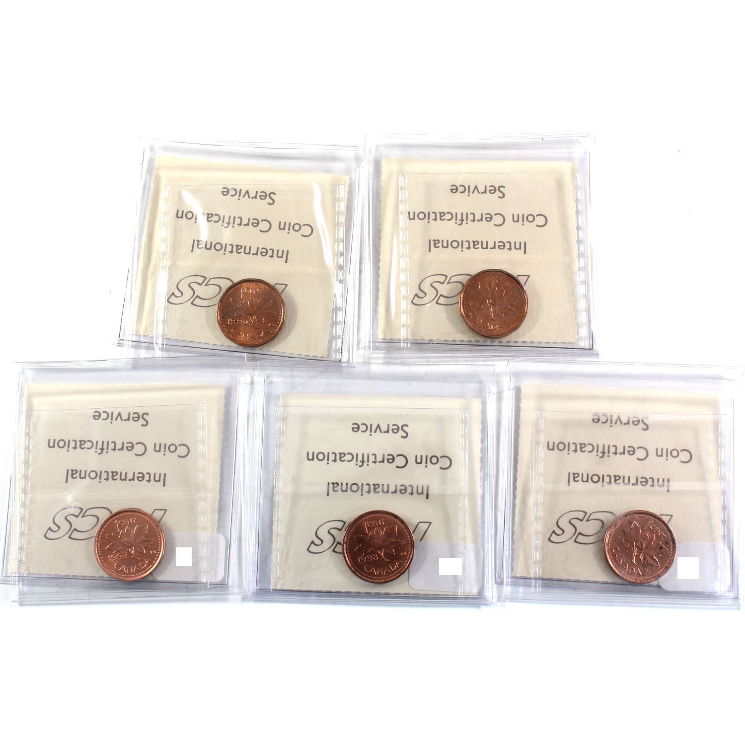 1990, 1991, 1997, 1998 & 1999 Canada 1-cent ICCS Certified MS-65 Red. 5pcs