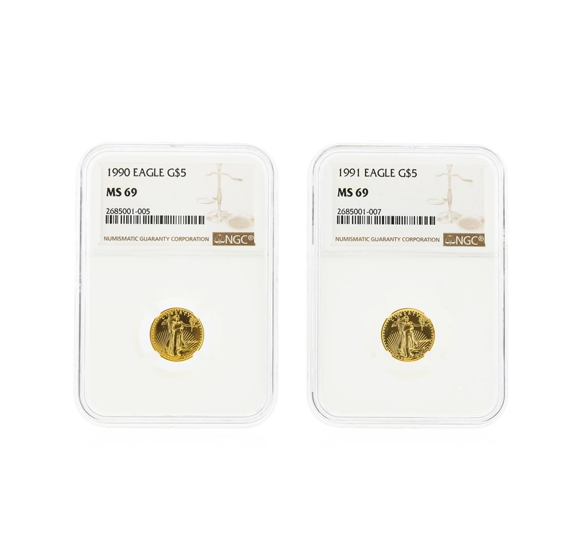 One 1990-1991 $5 American Gold Eagle Coin Set NGC Graded MS69. NGC Certified.