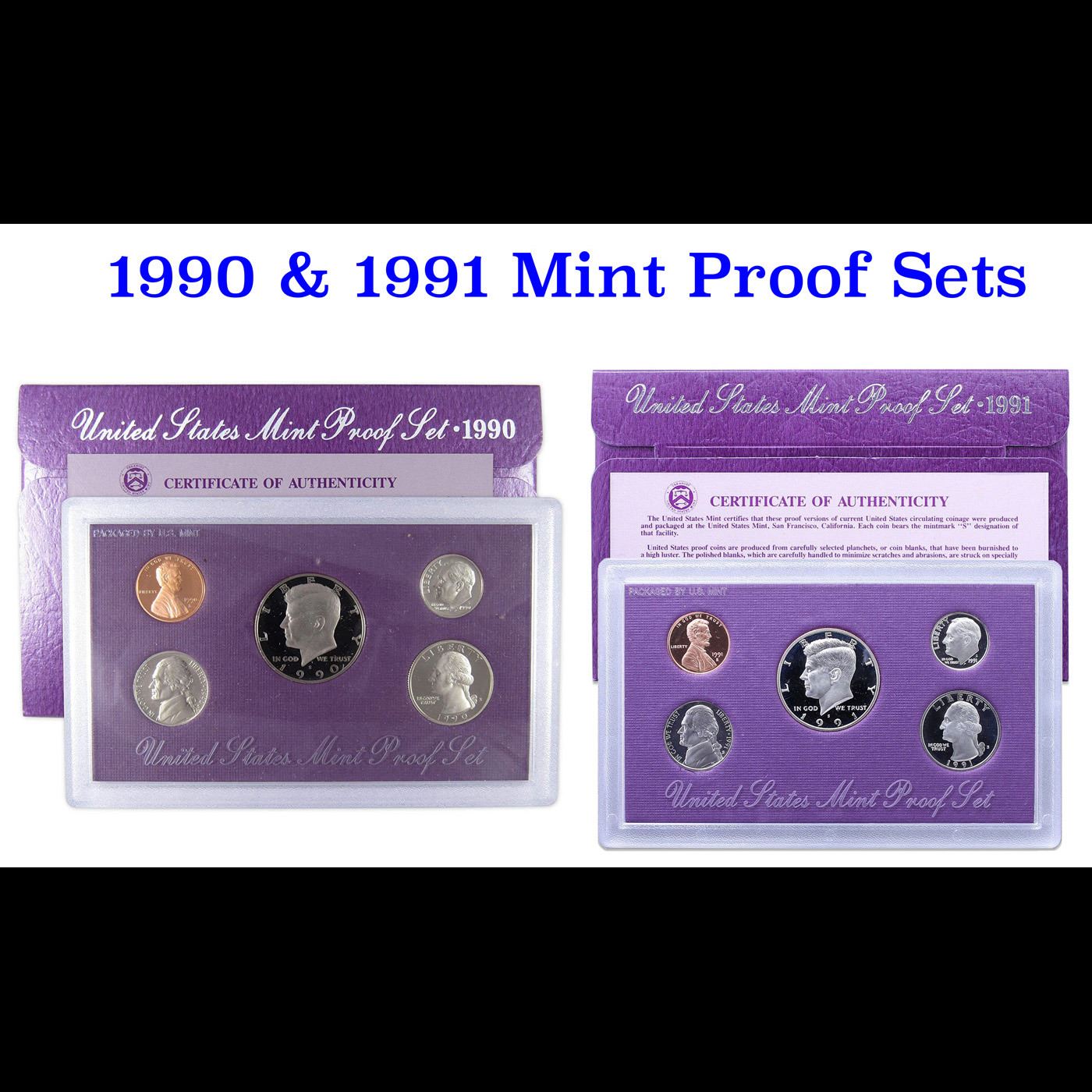 1990 & 1991 United States Mint Proof Sets. Each set Includes 5 Very Deep Cameo Proof Coins, the original Mint Packaging and the COA.