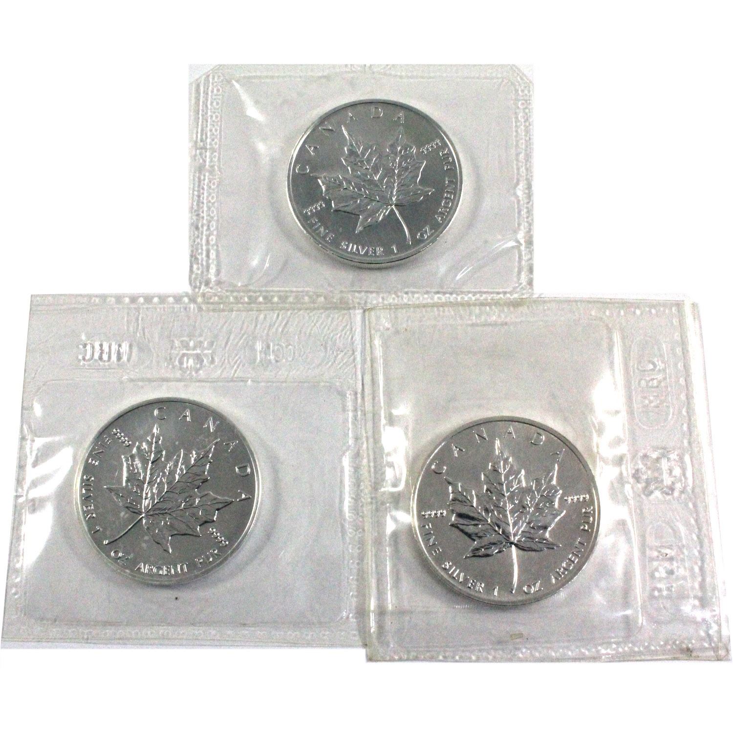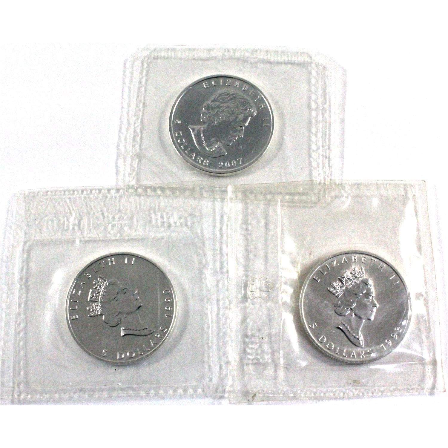 1990, 1993 & 2007 Canada 1oz .9999 Fine Silver Maple Leafs in Original Mint Sealed Plastic. 3pcs (TAX Exempt)