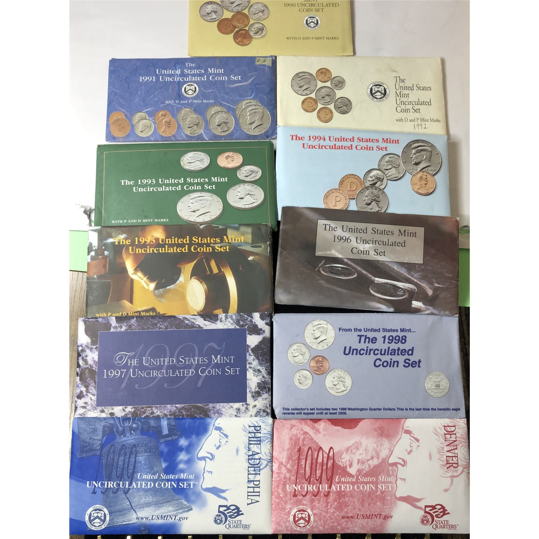 Ten (10CT) US Mint Sets 1990-1999. This offering includes all the Philadelphia and Denver Mint Issues, the 1999 States Quarters Issues, and the 1996 Mint set including the 1996 West Point Issue Dime. A great opportunity to obtain these more elusive 1990'S Mint sets.