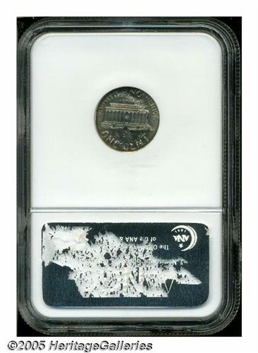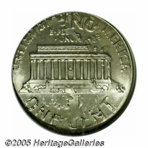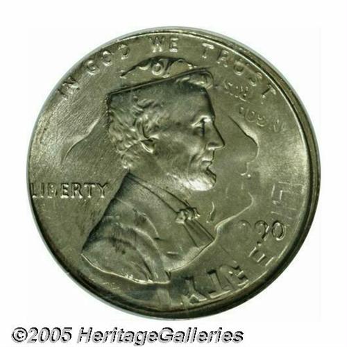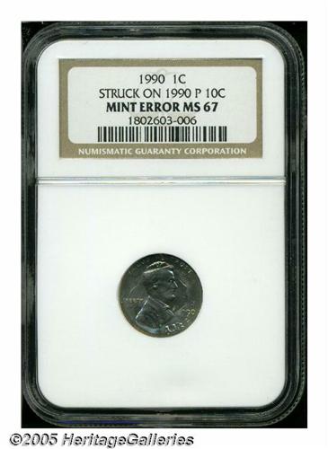 <B>1990<1C> Cent--Struck on 1990-P Dime--MS67 NGC.</B></I> Apparently, a 1990-P Dime was struck, then, somehow was placed in the planchet hopper for Cents and subsequently struck again, this time as a Lincoln Cent. Bold details of both strikings are seen on each side. A rare opportunity for the modern error collector.