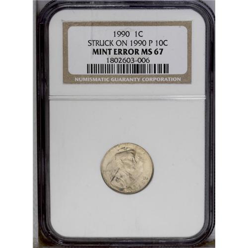 1990 1C Cent--Struck on 1990-P Dime--MS67 NGC. Both da 1990[1C] Lincoln Cent--Struck on 1990-P Dime-