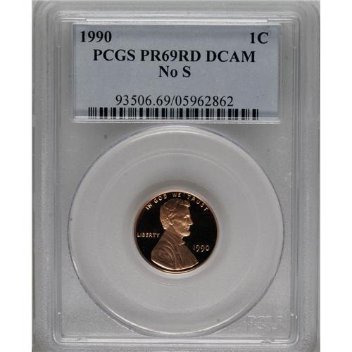 <B>1990 1C No S PR69 Deep Cameo PCGS.</B></I> It was in 1968 that the San Francisco Mint--or officially, the San Francisco Assay Office--took up the mantle of producing the United States' proof coins, accordingly adding an S mintmark on those pieces. In that same year the first No S proof coins were produced, the 1968 No S Roosevelt dimes. The same scenario has repeated several times since, and in 1990 somewhat less than 200 pieces of the 1990 No S Lincoln cent are believed to have escaped the facility. The present bright orange-red example is every bit as attractive and perfect as the day it left the proof dies. Population: 18 in 69, 0 finer (3/07).<BR><BR><b>Shipping:</b> Coins & Currency (<a target="_blank" href="http://www.heritageauctions.com/common/shipping.php">view shipping information</a>)