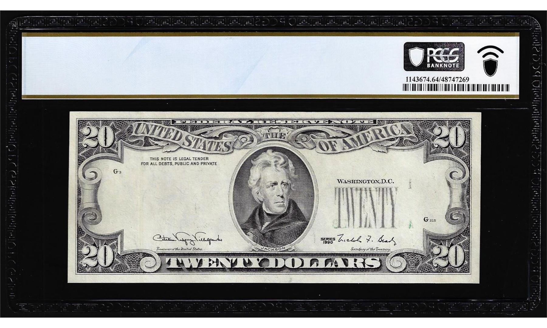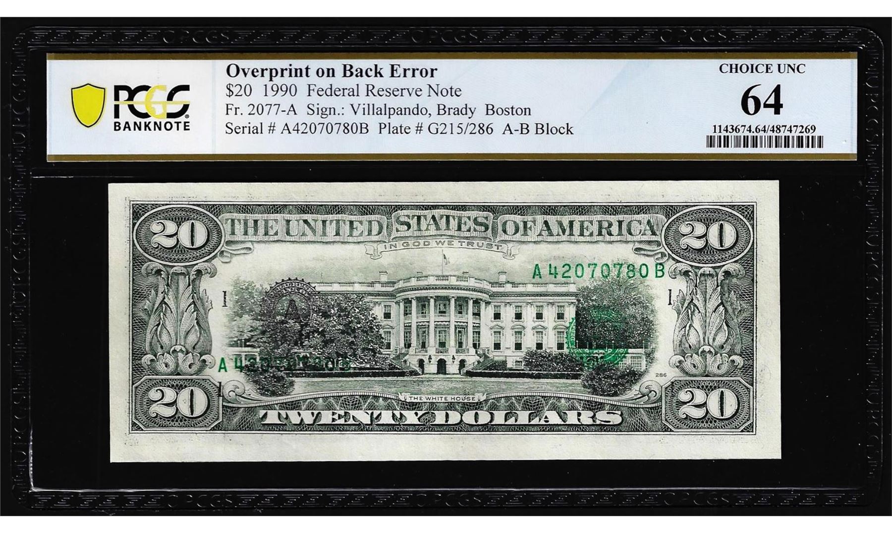 1990 $20 Federal Reserve Note Boston Overprint on Back Error PCGS Choice Unc 64