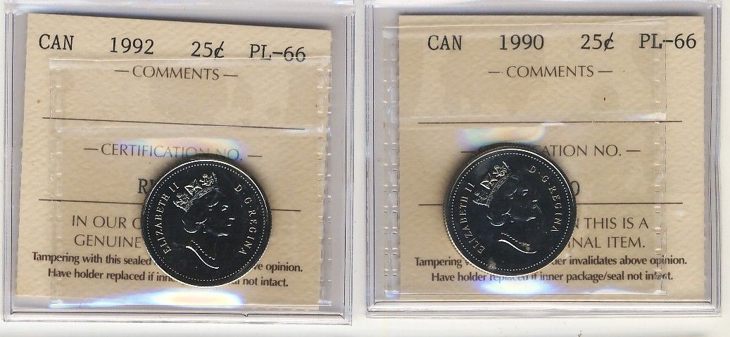 1990 25¢ & 1992 ICCS PL66. Lot of 2 coins.