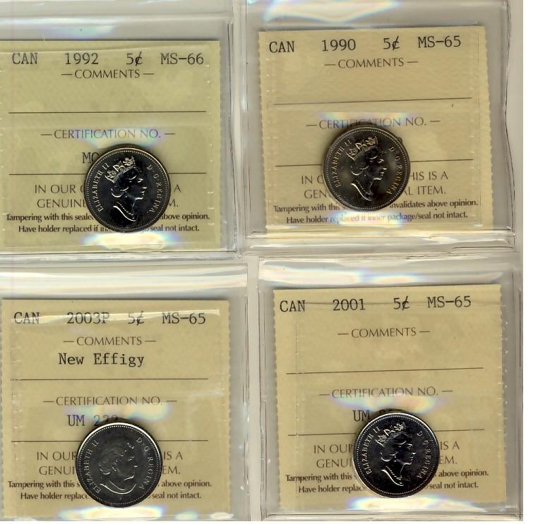 1990 5¢,2001 & 2003P ICCS MS65 & 1992 MS66. Lot of 4 coins.