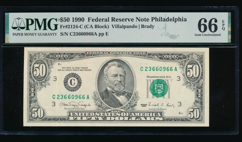 One 1990 $50 Philadelphia FRN PMG 66EPQ.