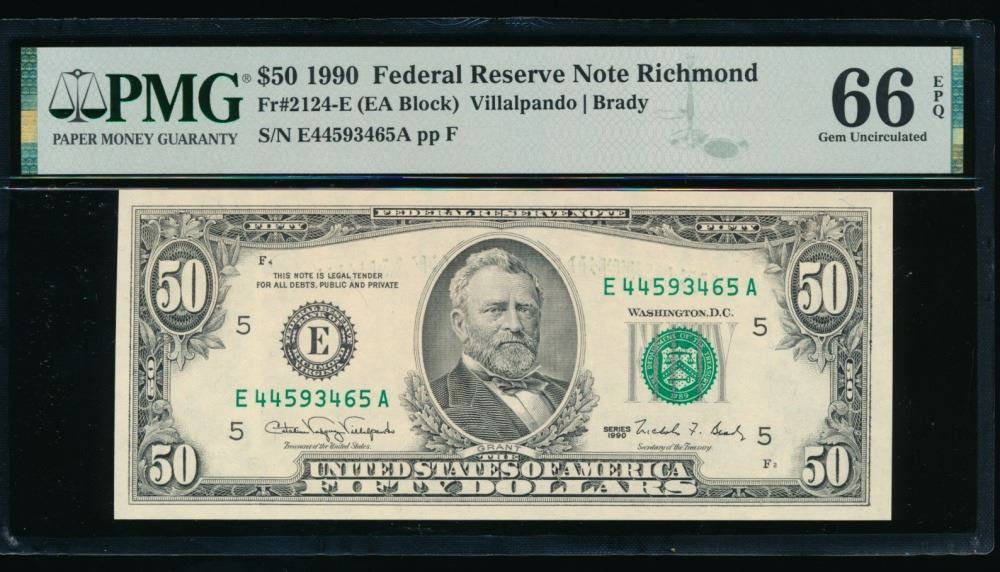 One 1990 $50 Philadelphia FRN PMG 66EPQ.