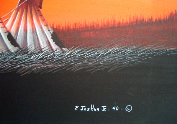 1990 Acrylic Painting Camp Site - E Joshua Jr. Brilliant red sunset painting by Oklahoma Native American artist, E Joshua Jr. This is titled ''Camp Site'' and depicts three teepees with smoke rising from their sky openings. It measures 16''H x 20''W. On poster board.