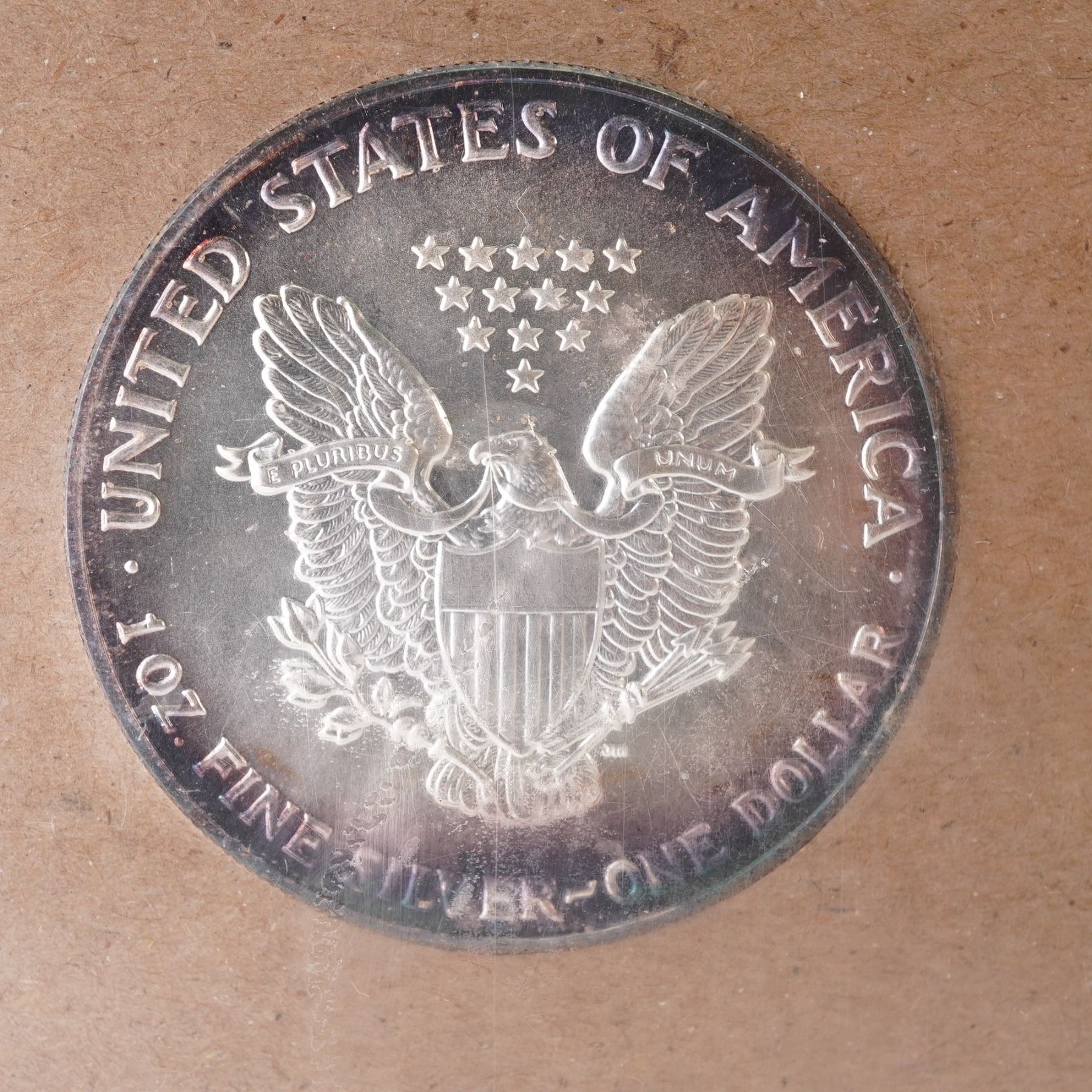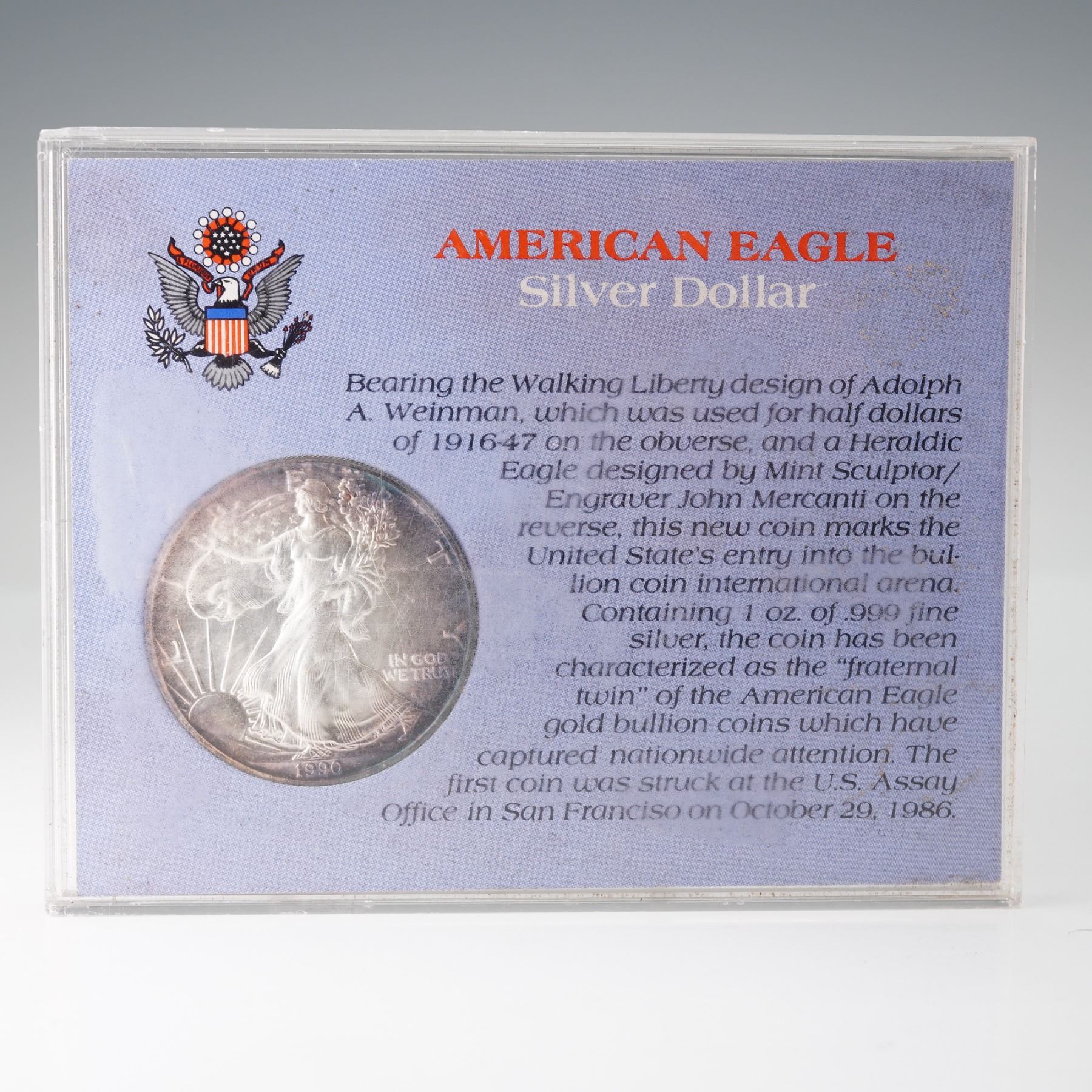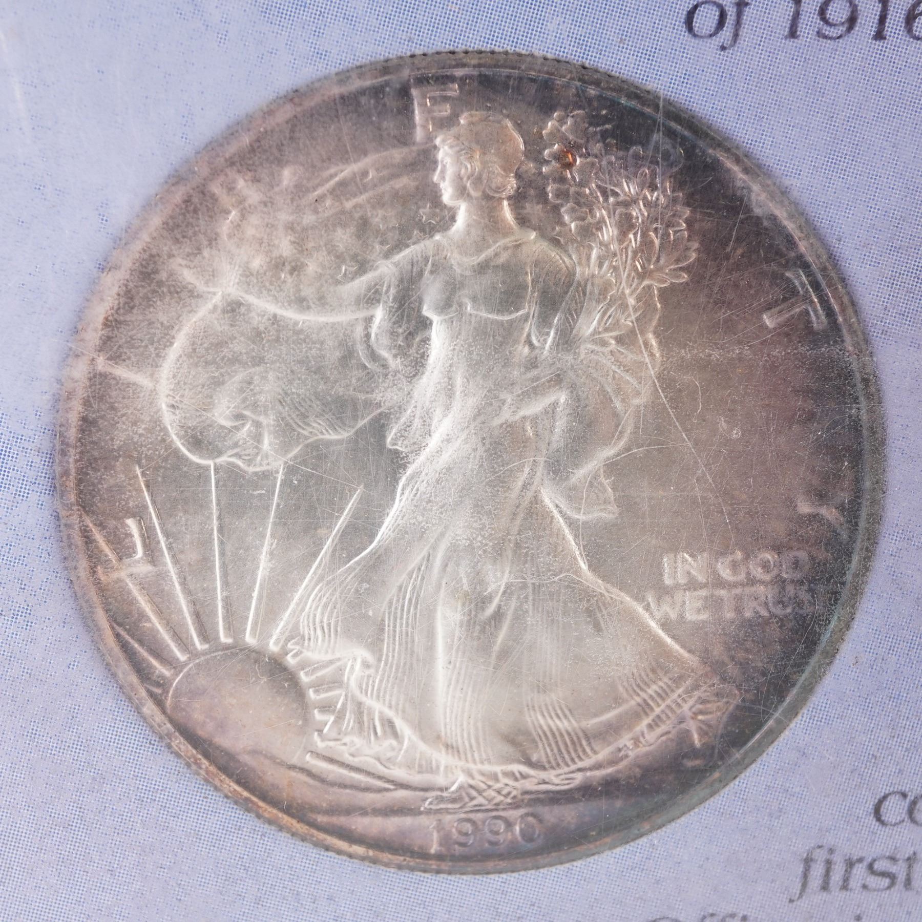 Originally used for half dollars from 1916 to 1947, the obverse features Lady Liberty draped in the American flag, striding toward the sunrise while carrying laurel and oak branches. The reverse, designed by John Mercanti, depicts a heraldic eagle with a shield, arrows, and olive branch, along with thirteen stars above representing the original colonies. Inscriptions include LIBERTY, IN GOD WE TRUST, UNITED STATES OF AMERICA, ONE DOLLAR, and 1 OZ FINE SILVER. Metal Content: Contains one troy ounce of .999 fine silver. Mint Facility: San Francisco (S).
