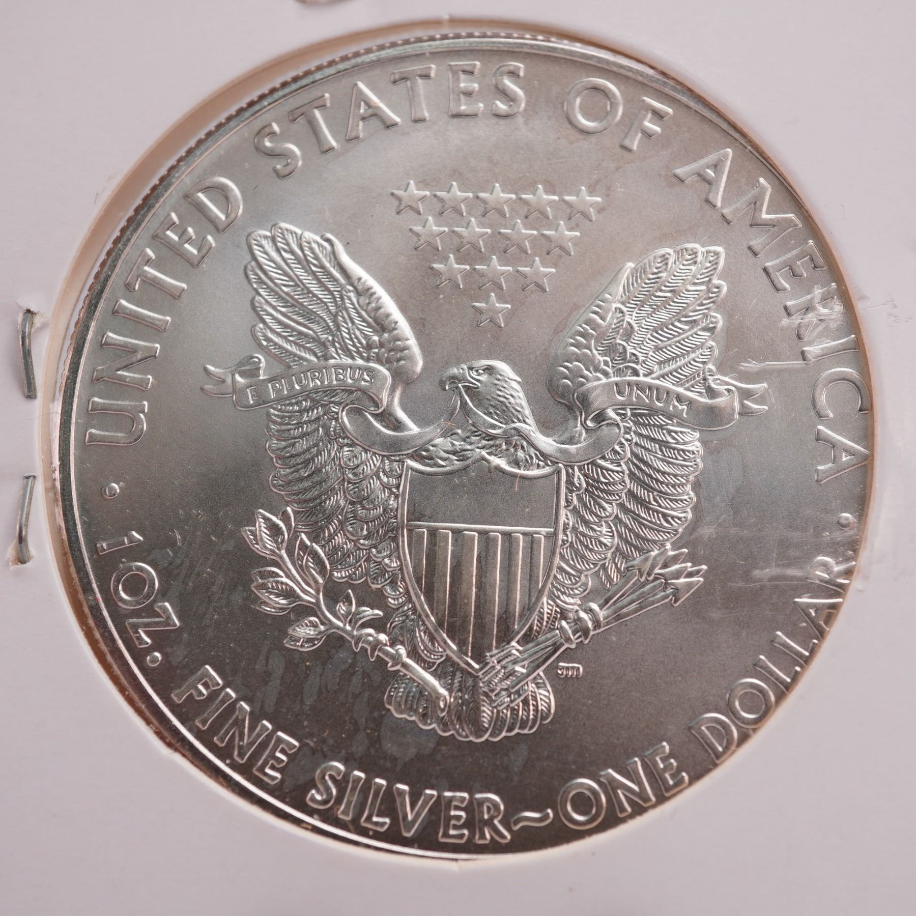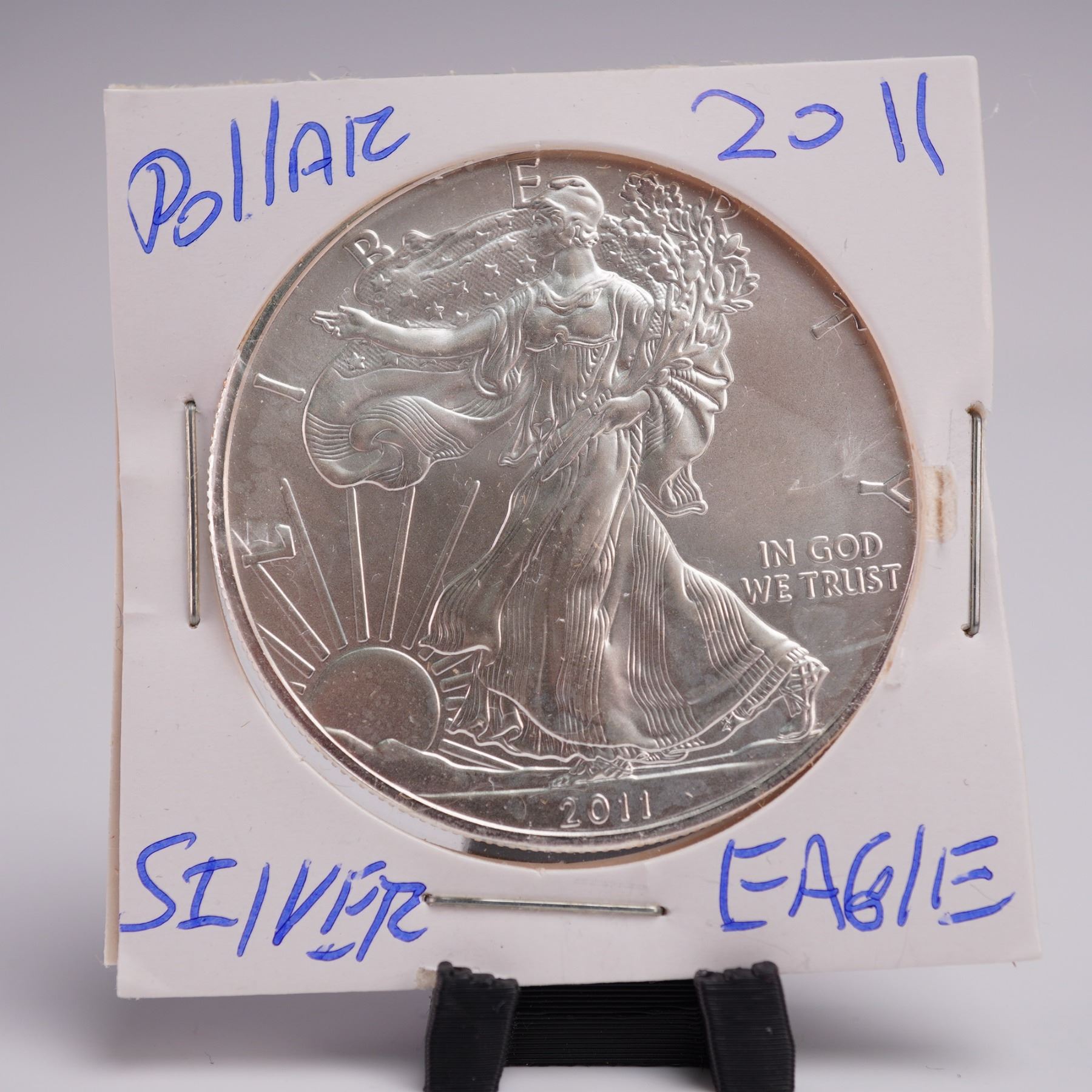 This 2011 American Silver Eagle one dollar coin composed of one troy ounce of .999 fine silver. The obverse displays the Walking Liberty design, an iconic composition by Adolph A. Weinman that portrays Liberty striding purposefully toward the sunrise, her right hand extended and her left arm cradling branches of oak and laurel, enveloped in the billowing folds of the American flag. The face motif encircled with LIBERTY, IN GOD WE TRUST, and the date 2011. The reverse features the heraldic eagle emblem sculpted by John Mercanti, exhibiting a powerful eagle with a shielded chest, clutching arrows and an olive branch in its talons, framed by a ribbon bearing the motto E Pluribus Unum and thirteen stars overhead symbolizing the original colonies. Enclosed in a cardboard holder. Holder measures: 2"L x 2"H. Coin diameter: 40.6 mm.