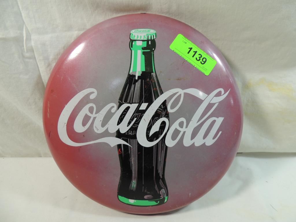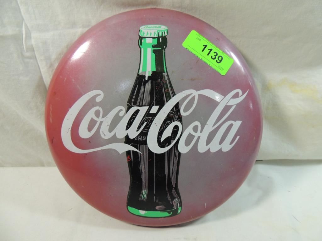 VINTAGE COCA COLA ROUND BUTTON METAL ADVERTISING SODA TACKER TYPE METAL SIGN NASTALGIA COLLECTIBLE AS SHOWN SEE PHOTO FOR MORE DETAILS.