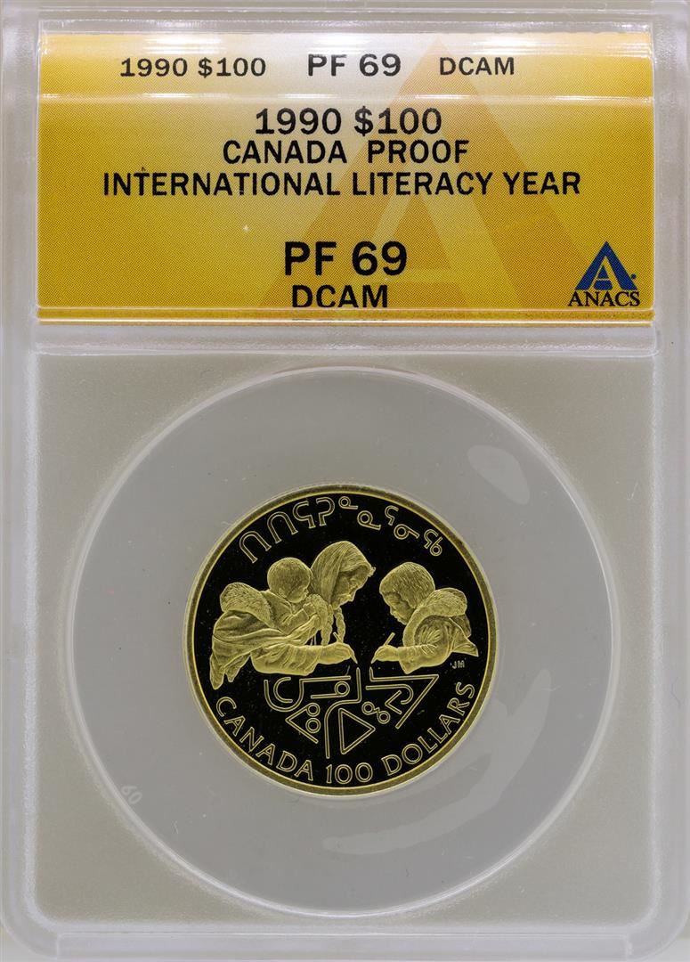 One 1990 Canada $100 International Literacy Gold Proof Coin ANACS PF69DCAM. ANACS Certified.