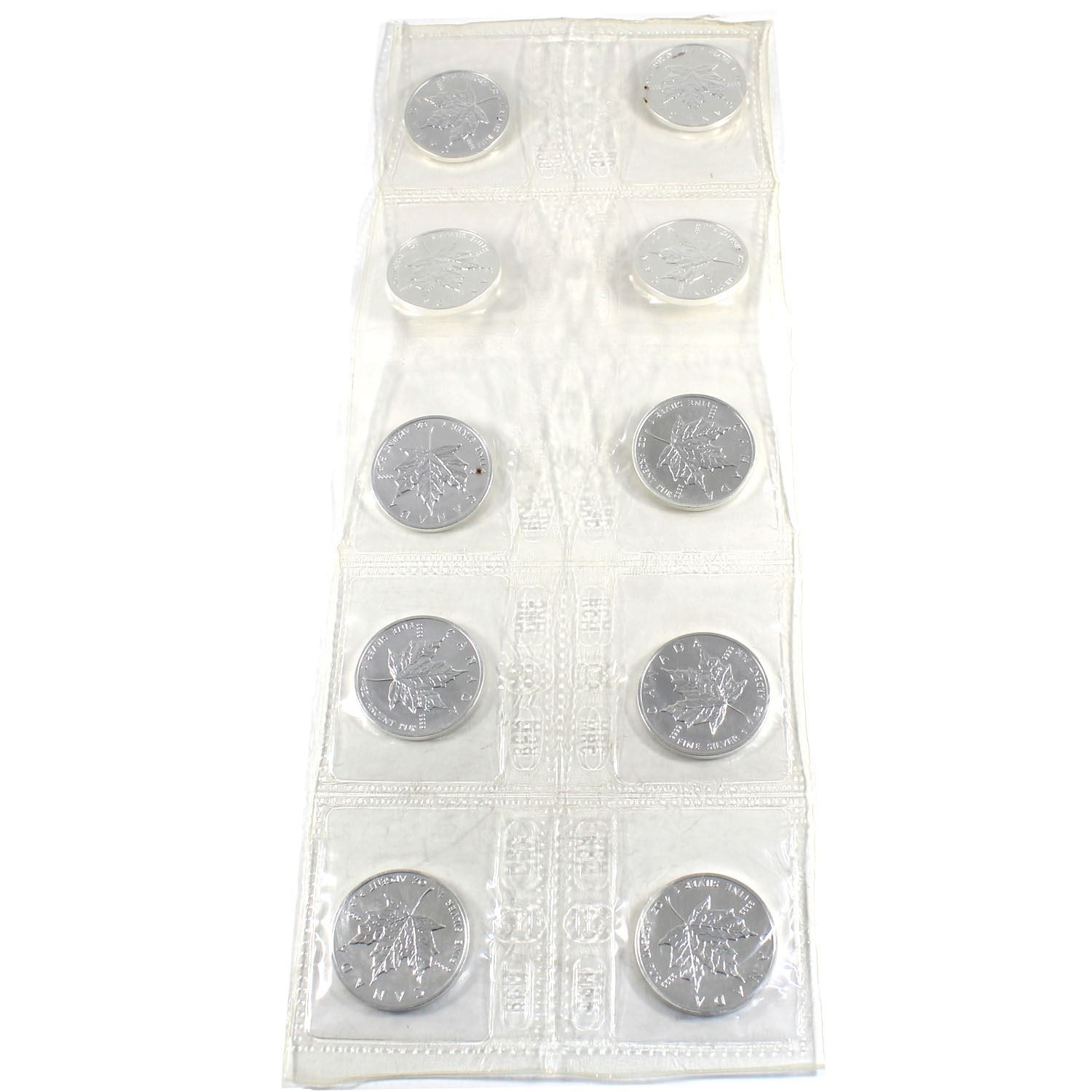 1990 Canada 1oz .9999 Fine Silver Maple Leafs in Sealed Mint Sheet (a few coins are lightly toned). 10pcs (TAX Exempt)