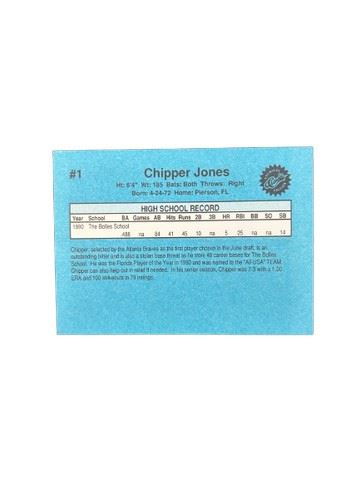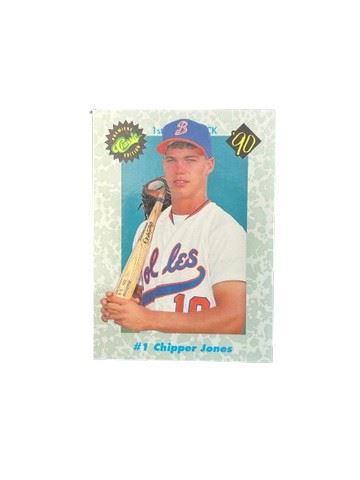 1990 Chipper Jones Classic #1 Premiere Edition Atlanta Braves Chipper Jones rookie trading card. Chipper was selected by the Atlanta Braves as the first player chosen in the June draft.
