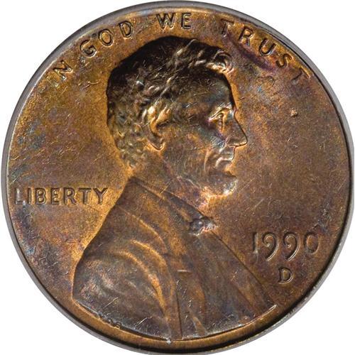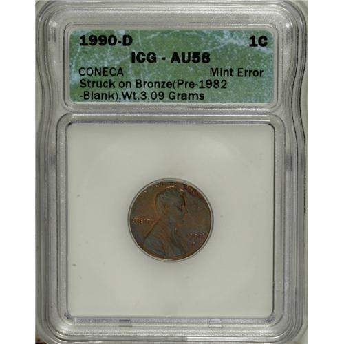 <B>1990-D 1C Lincoln Cent--Struck on a Bronze (Pre-1982) Blank--AU58 ICG.</B></I> 3.09 gm. This lustrous and sharply struck piece features rich ice-blue, fire-red, and aquamarine toning. The obverse has a few peripheral lintmarks, as made. Apparently, a copper blank hid for years under or within Denver Mint equipment, or was held back by a third party cent blank vendor.<BR><I>From The Pacific Coast Mint Error Collection.</B></I><BR><BR><b>Shipping:</b> Coins & Currency (<a target="_blank" href="http://www.heritageauctions.com/common/shipping.php">view shipping information</a>)