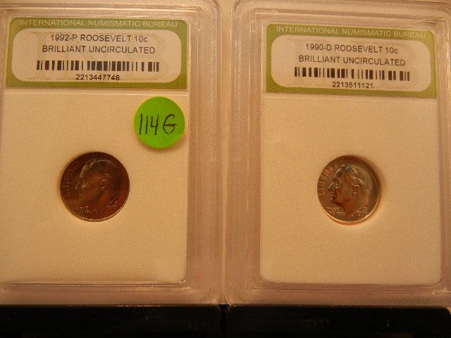 1990-D UNC. BU Roosevelt Dime & 1992- P UNC. BU Roosevelt Dime Graded By INB