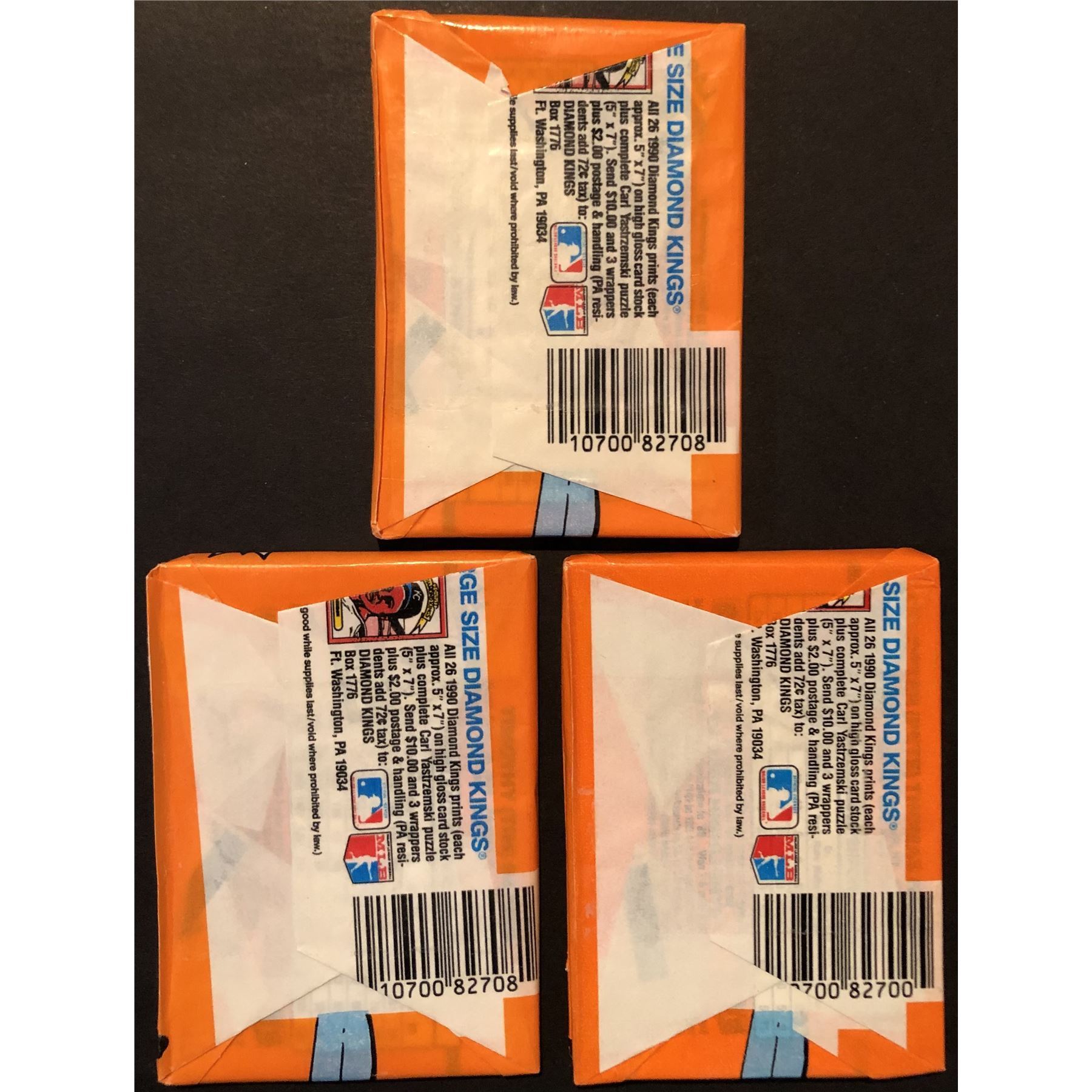 1990 DONRUSS Baseball wax packs (3 packs). Two of the packs contain 16 cards & 3 puzzle pieces. One of the packs contains 10 cards & 3 puzzle pieces.