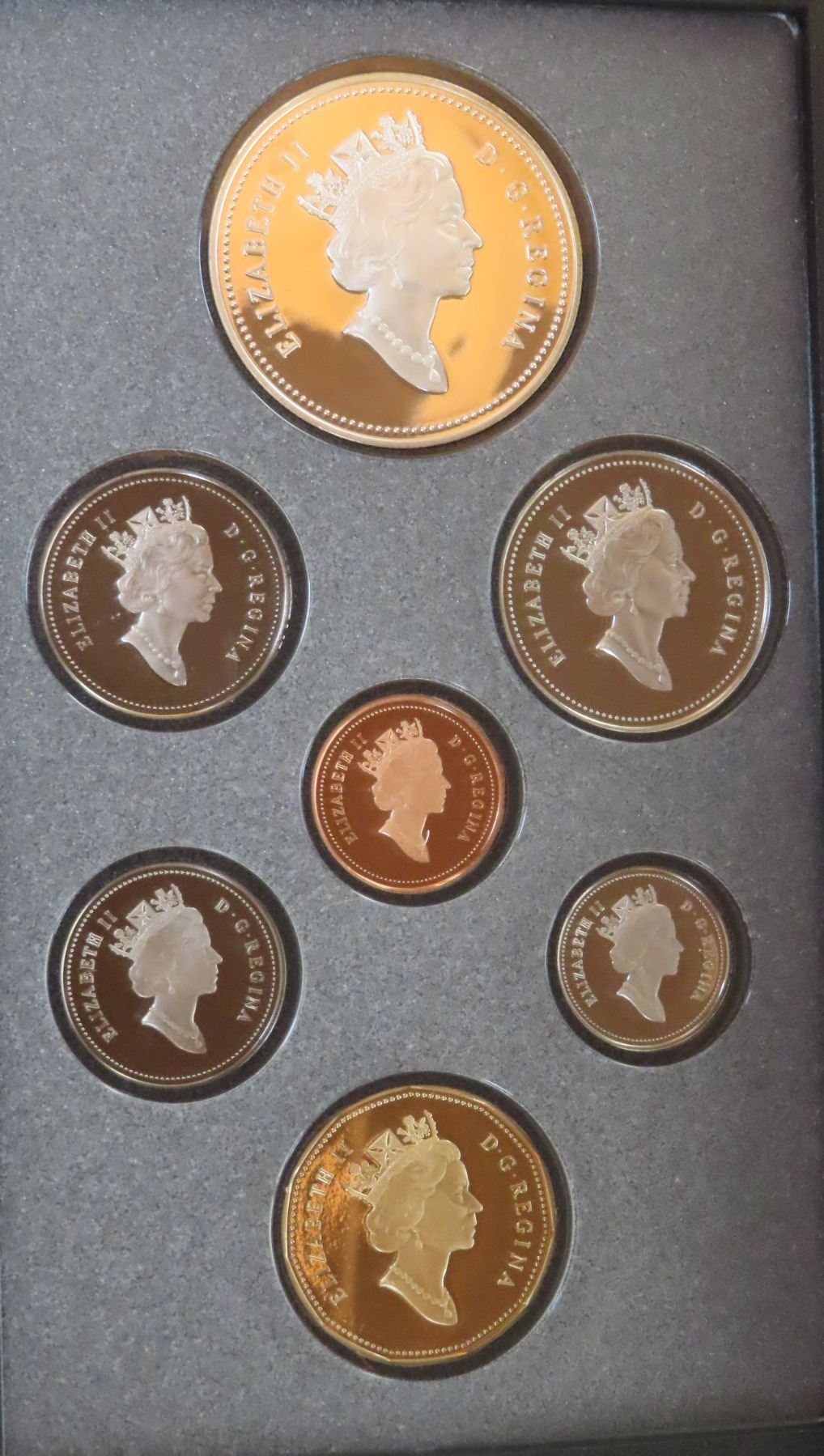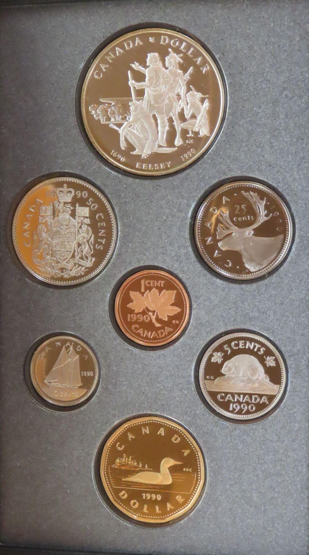 1990 Double Dollar Proof Set. Silver Dollar commemorates the 300th Anniversary of HBC fur trader Henry Kelsey’s explorations of the Canadian West. All coins display Ultra Heavy Cameos. Housed in its original RCM case of issue.