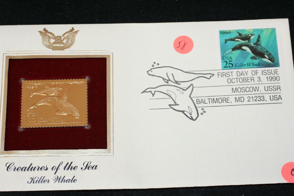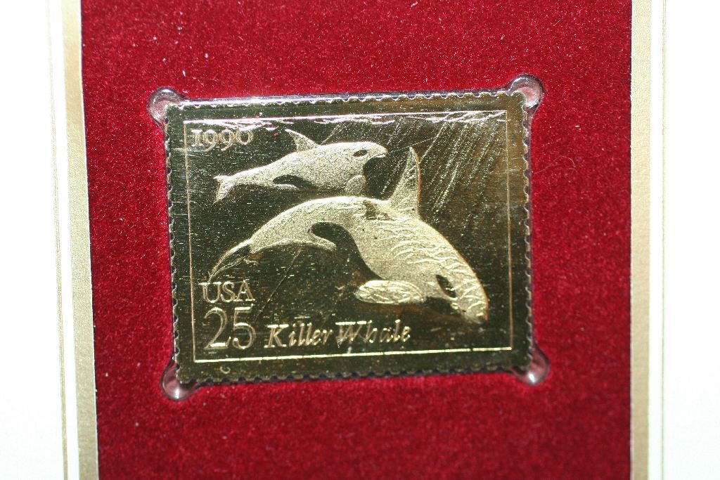 1990 First Day Issue 22K Gold Replica Stamp W/Postal Stamp; Creatures of the Sea Killer Whale