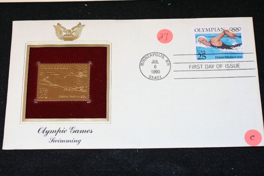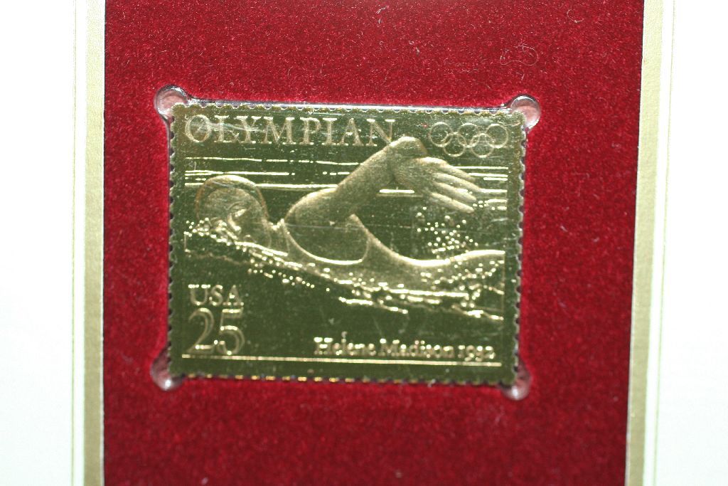 1990 First Day Issue 22K Gold Replica Stamp W/Postal Stamp; Olympic Games Swimming