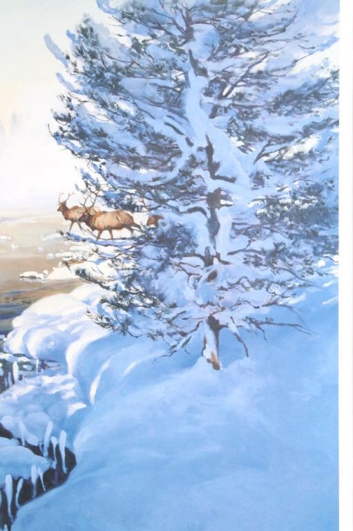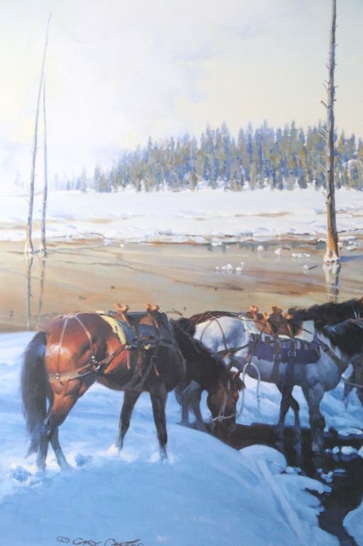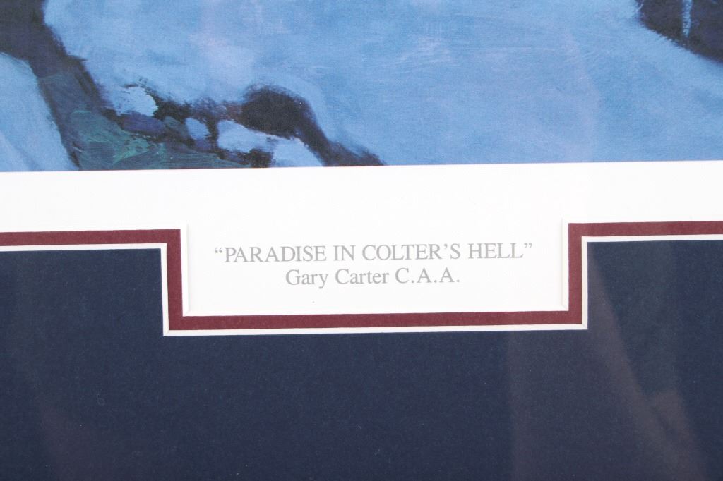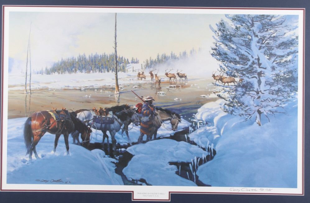 Featured in this lot is this Artist Proof chromolithograph by Montana artist Gary Carter, originally from 1990 and called "Paradise in Colter's Hell." The artwork features a mountain man walking beside his horse and holding the reins of two pack horses. The background features a majestic herd of elk and fresh snow covering the ground and the surrounding trees. The artist’s signature can be seen in the bottom right-hand corner with the Artist Proof marking and number 19/85. Gary Carter is a Yellowstone, Montana artist and was inducted into the Cowboy Artist of American (CAA Member) in 1982. Gary Carter was also adopted into the Crow Tribe and Real Bird Family and made a member of the Big Lodge Clan, given the name of “Eagle Man”. The condition of this framed chromolithograph lithograph is good, with no obvious signs of damage. The measurements of this framed chromolithograph are 30 3/4" x 43 1/8" x and the visible art measures 19 3/4" x 32 5/8".