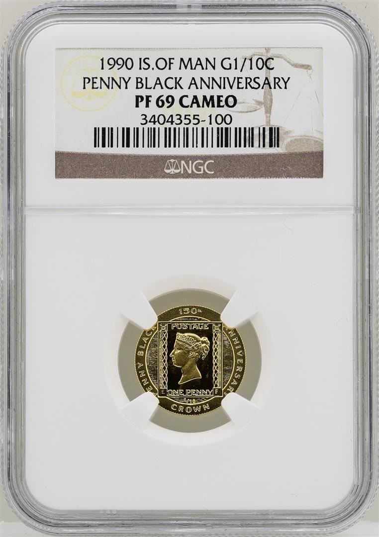 One 1990 Isle of Man Penny Black Anniversary 1/10 oz. Gold Coin NGC PF69 Cameo. NGC Certified.