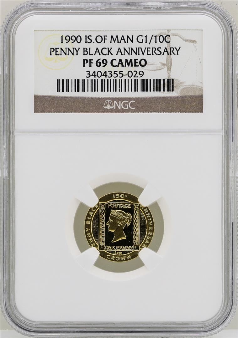 One 1990 Isle of Man Penny Black Anniversary 1/10 oz. Gold Coin NGC PF69 Cameo. NGC Certified.